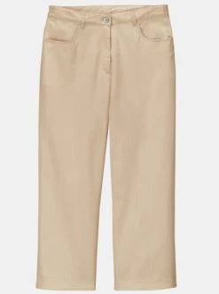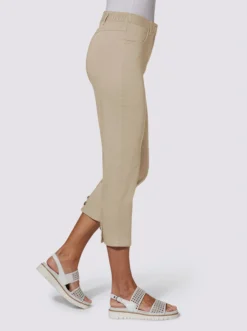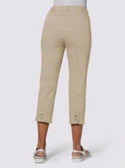 7⁄8-Hose mit seitlichem Dehnbund. Streckende Beinnähte und abgerundete Schlitze mit 2 Schmuckknöpfen. Knopf- und Reißverschluss vorne, Gürtelschlaufen.