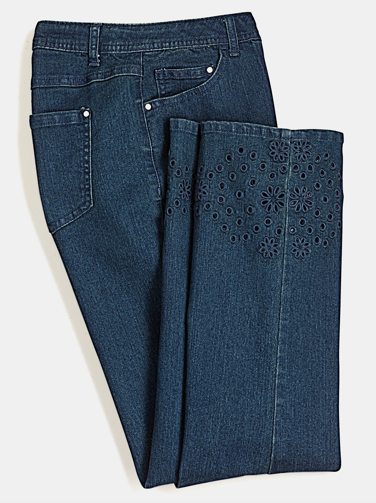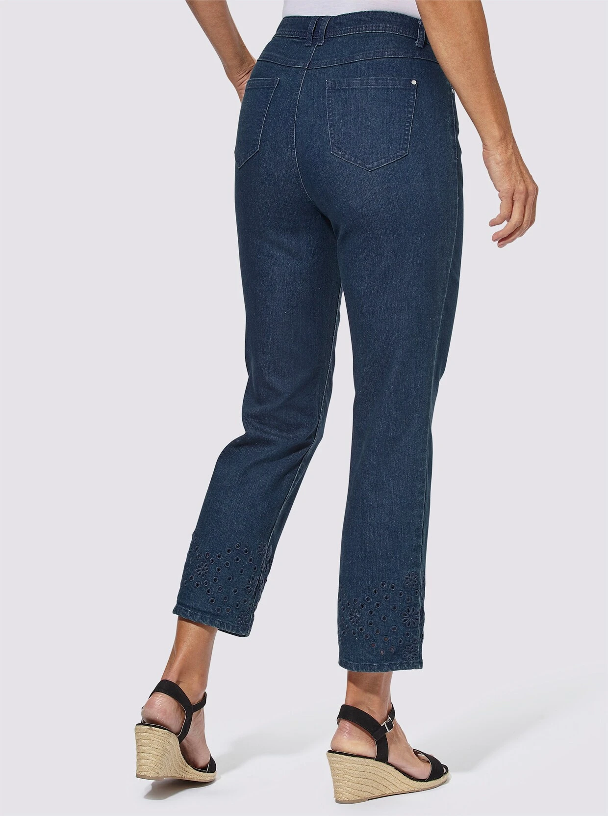Das Beste kommt zum Schluss: 7/8-Jeans mit floraler Lochstickerei am Saum. In der beliebten 5-Pocket-Form mit Nietenverzierung an den Taschen. Formbund, Gürtelschlaufen sowie Knopf- und Reißverschluss vorne. Fußweite ca. 36 cm. Ohne Gürtel.
