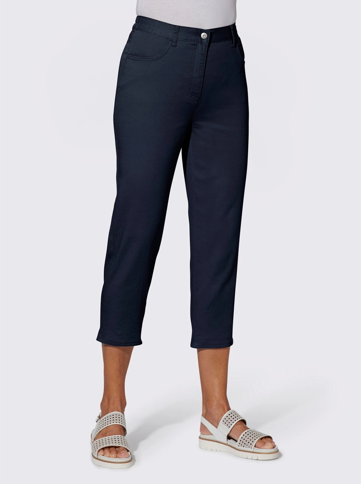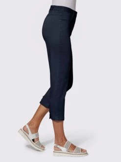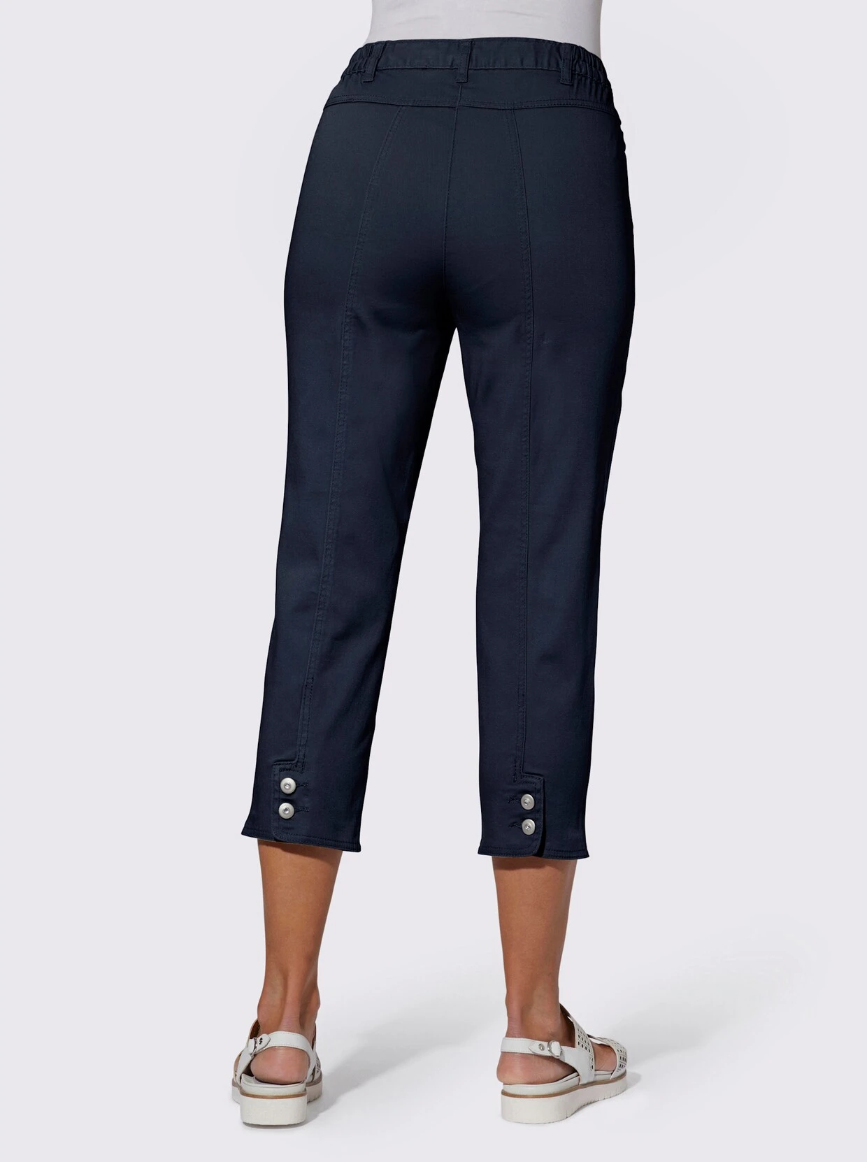 7⁄8-Hose mit seitlichem Dehnbund. Streckende Beinnähte und abgerundete Schlitze mit 2 Schmuckknöpfen. Knopf- und Reißverschluss vorne, Gürtelschlaufen.