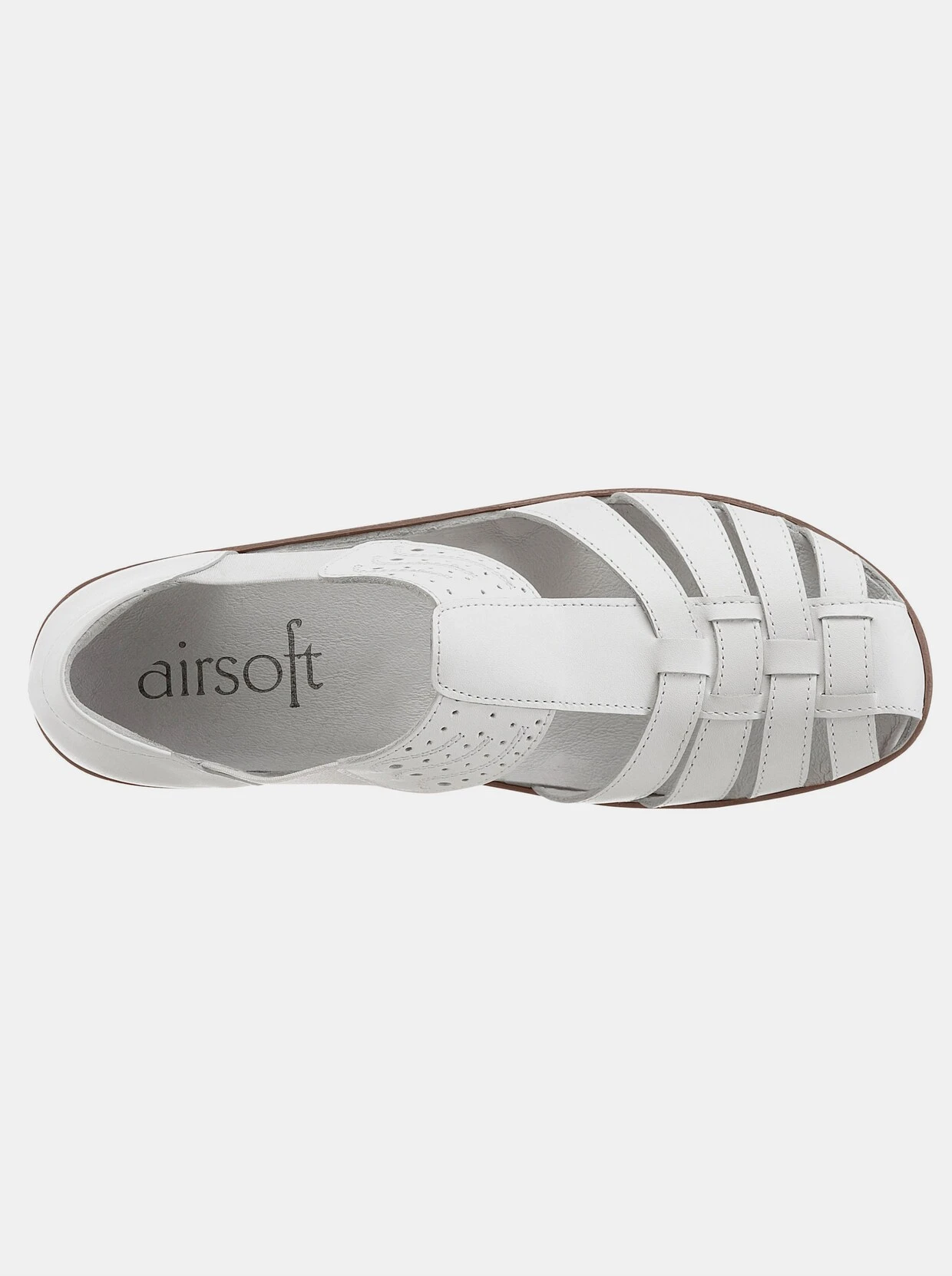 Attraktiver Slipper von Airsoft aus Leder. Mit schmückendem Webeinsatz vorne und seitlichen Gummizügen. Innenausstattung: Leder. Rutschhemmende PU-Laufsohle. Absatz ca. 25 mm. Weite G.