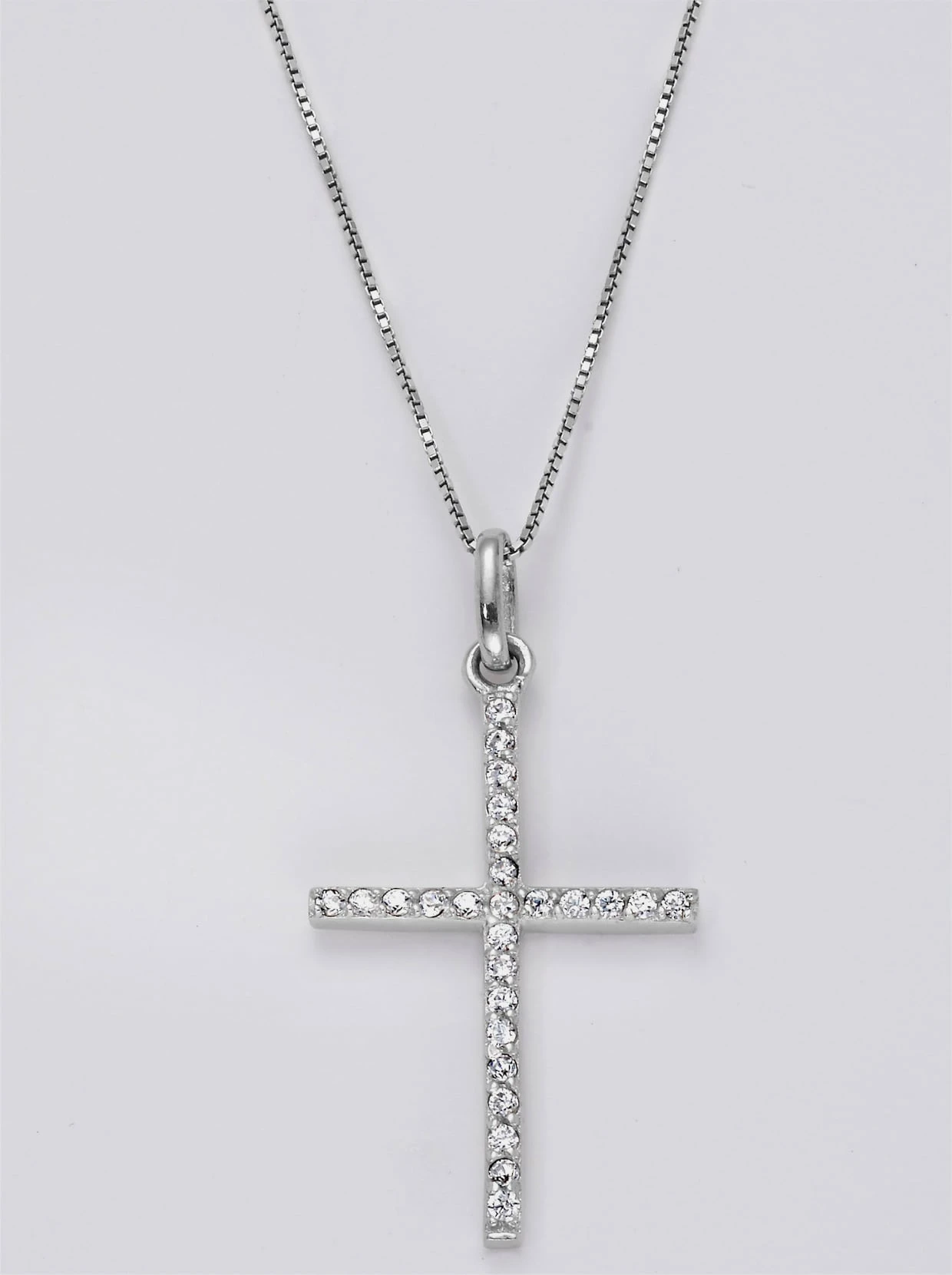 Anhänger mit Kette aus Silber 925. Kreuz mit unzähligen Kristallsteinen. Mit Kette Länge ca. 45 cm. Ringverschluss. Länge ca. 3 cm.