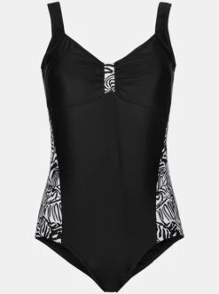 Die seitlichen Einsätze im Zebra-Muster setzen tolle Akzente – ansonsten zeigt sich der Badeanzug sehr elegant in Uni mit V-Ausschnitt, Soft-Cups mit Raffungen, Unterbrustband und geschickt platzierten Teilungsnähten vorne. Komplett gefüttertes Vorderteil. Runder Rückenausschnitt.