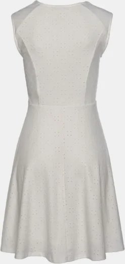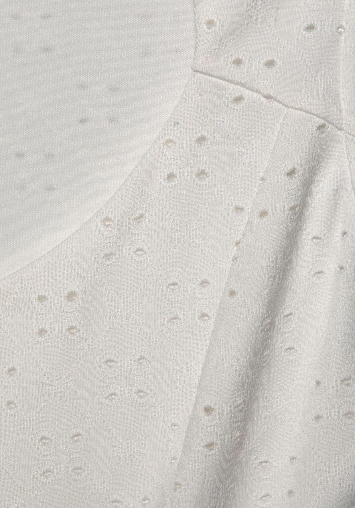 Kleid von Beachtime. Weiter Rundhalsausschnitt. Gummibund in der Taille. Schmeichelnde Nahtführung im Oberteil. Ausgestellter Rock. Oberstoff mit Lochstickerei. Komplet gefüttert. Obermaterial: 95% Polyester, 5% Elasthan. Futter: 100% Polyester