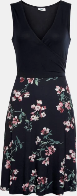 Ärmelloser Look mit gewickeltem V-Ausschnitt. Rockteil in A-Form. Jedes Kleid ein Unikat. Rocklänge ca. 55 cm. Elastische Qualität aus 95% Viskose, 5% Elasthan.