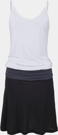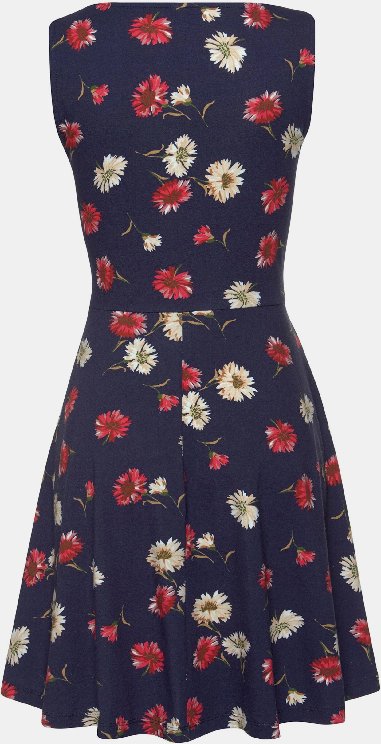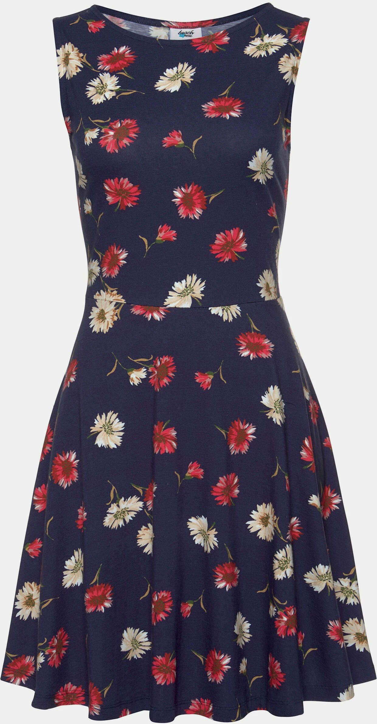 Beachtime Strandkleid mit breiten Tanktopträgern. Schöner Rundhalsausschnitt vorne. Hinten normal geschnitten. Ausgestelltes, leicht schwingendes Rockteil. Allover bedruckt, jedes Teil ein Unikat. Rückenlänge ca. 88 cm. Aus 95% Baumwolle, 5% Elasthan.