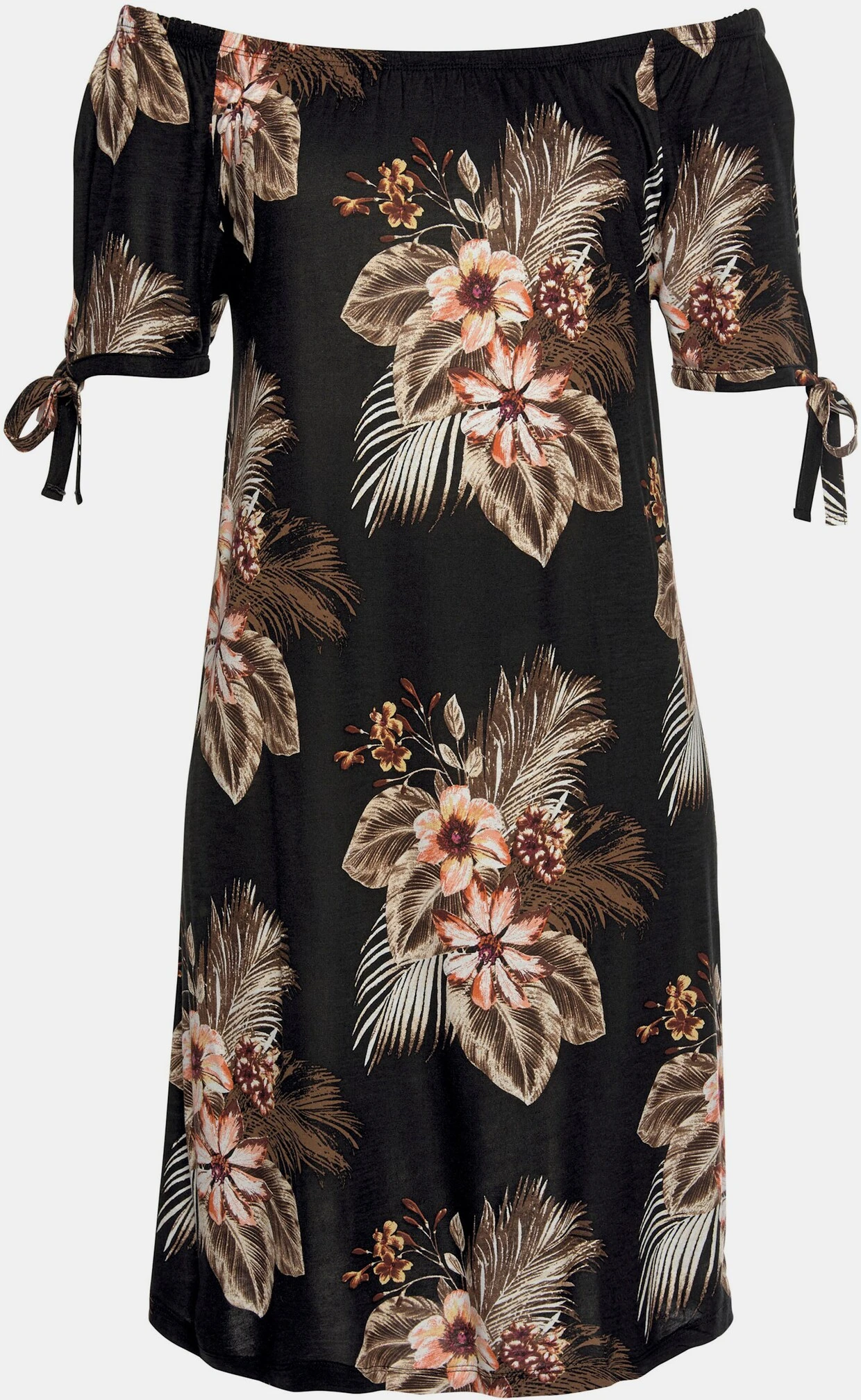 Mit elastischem Carmenausschnitt. An den kurzen Ärmeln mit Bändern zum Knoten. Lässig geschnitten. Jedes Teil ein Unikat! Rückenlänge ca. 78 cm. Angenehme Qualität aus 100% Viskose.