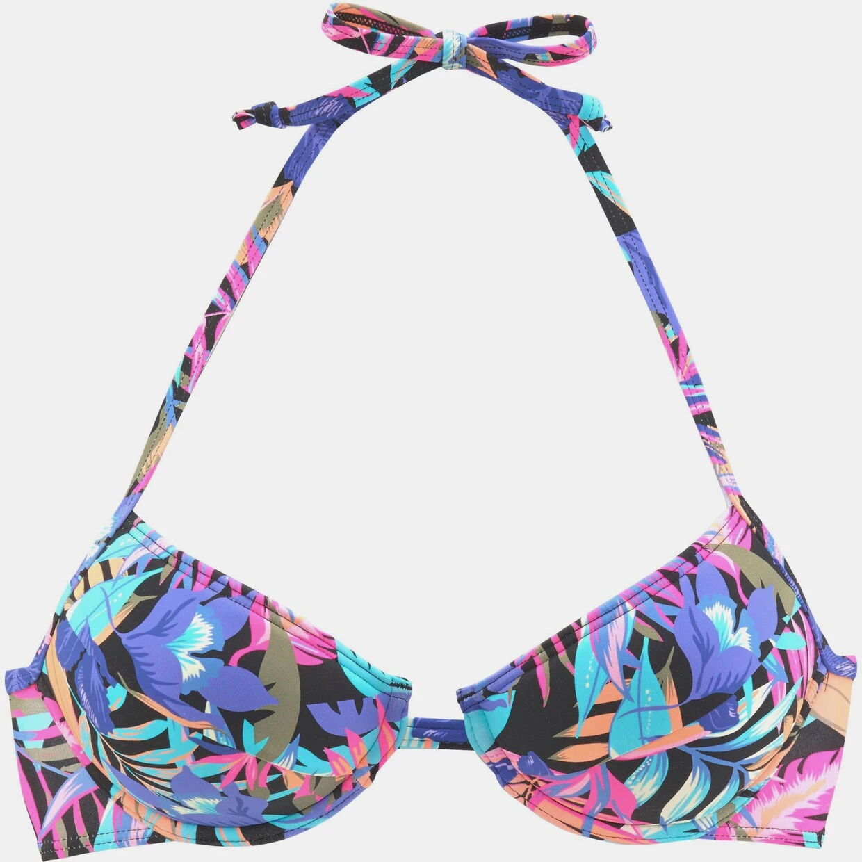 Mit wattierten Cups und herausnehmbaren Kissen. Im Nacken zu binden und im Rücken zu schließen. Bedruckt oder in 2 Unifarben. Softe Microfaser.