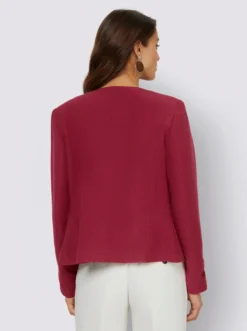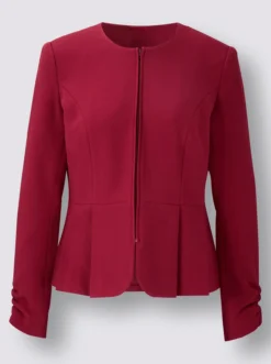 Blazer Wunderbar feminin interpretiert mit doppelt gelegten Falten am Schößchen und Raffung an den langen Ärmeln. Rundhals-Ausschnitt, Schulterpolster, verdeckter durchgehender Reißverschluss. Figurformende Teilungsnähte.