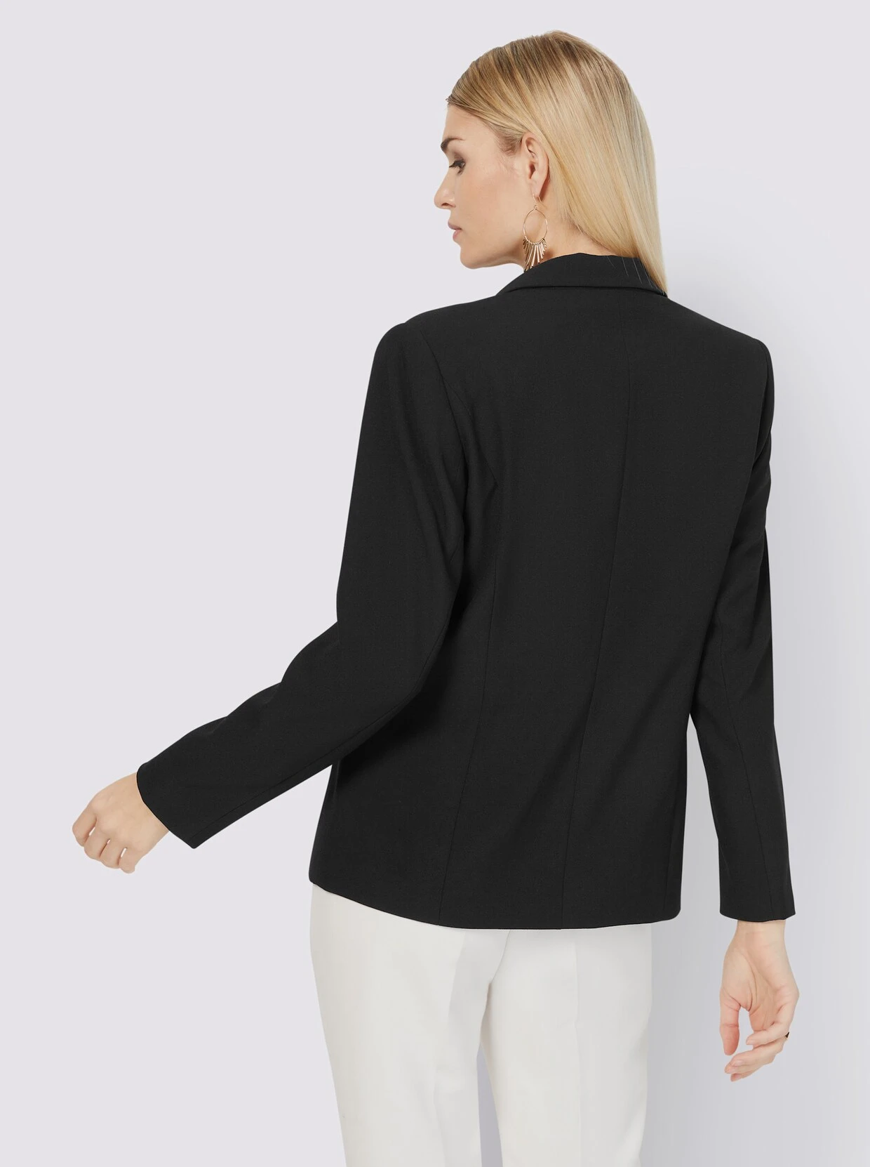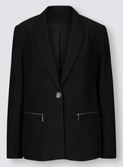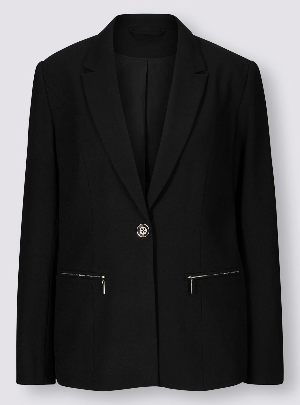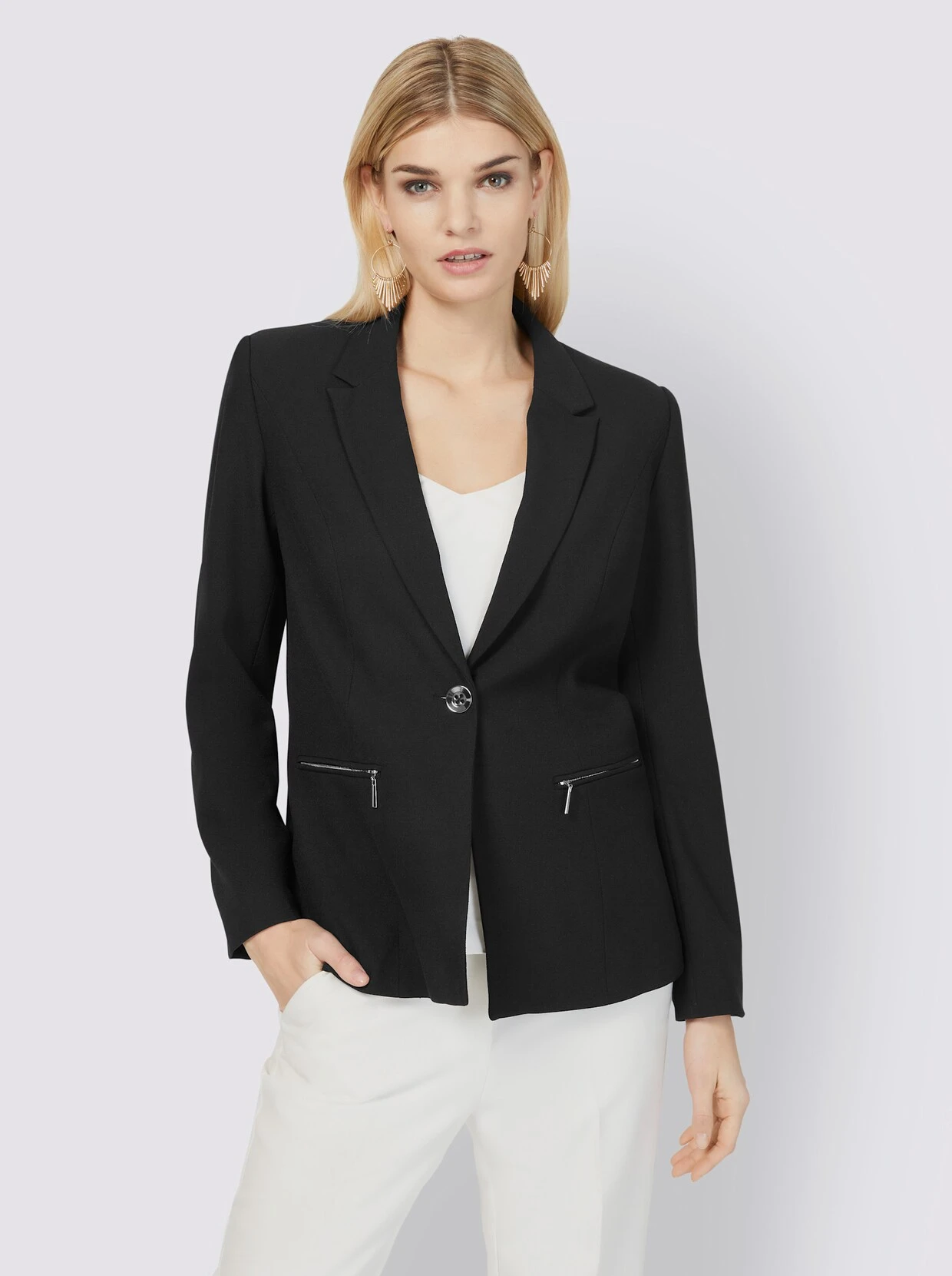 Super bewegungselastisch zeigt sich der Blazer mit langem, streckendem Reverskragen und 2 Reißverschluss-Taschen. Auf 1 silberfarbenen Knopf zu schließen. Wiener Nähte und Schulterpolster formen eine schöne Silhouette. Dank seiner knitterarmen Kofferqualität ist er bestens auch für Reisen geeignet.