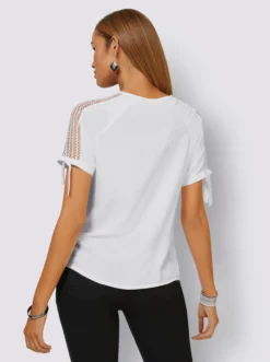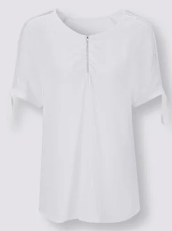 Für echte Wow-Momente sorgt diese trendige Bluse aus weich fließender Viskose. Der leicht transparente Spitzen-Einsatz ziert den V-Ausschnitt mit kurzem Reißverschluss und vorteilhaften Raffungen seitlich und die kurzen Raglan-Ärmel, die mit breiten Bändern enden.