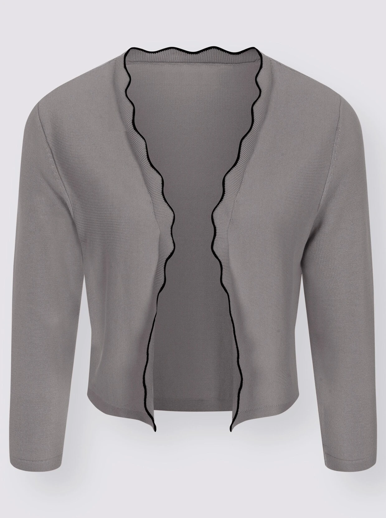 Kombi-Liebling für alle Anlässe: wunderschöner Strickbolero in weicher Feinstrick-Qualität. Typisch kurze Form ohne Verschluss an den feminin gebogten Kanten, die in Kontrastfarbe abgesetzt sind. Mit 3/4-Ärmeln.