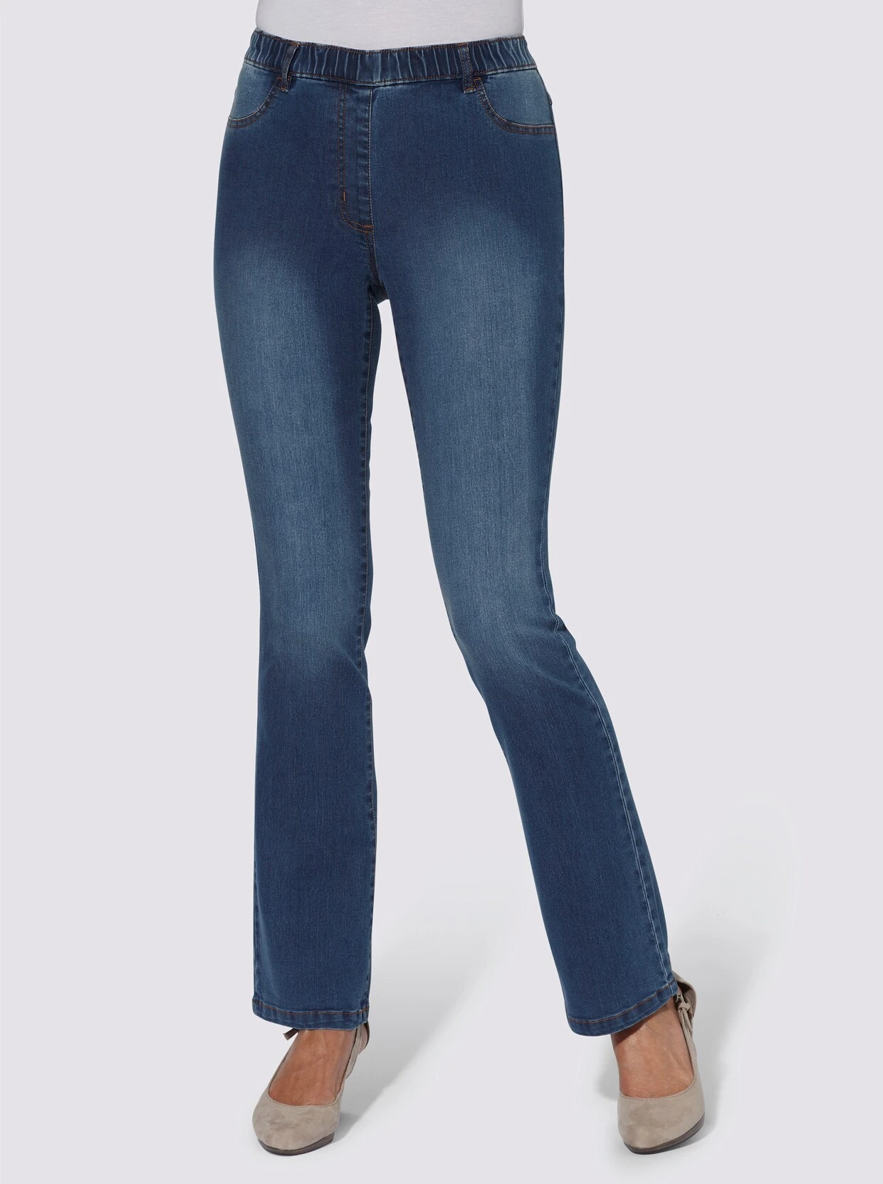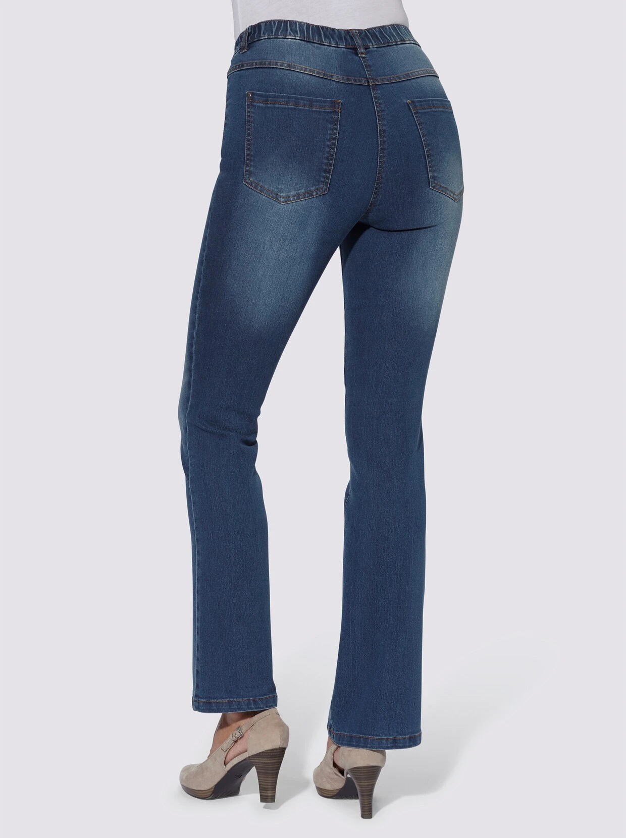 Bequem und topaktuell zeigt sich diese Jeans mit Rundum-Dehnbund im Boot-Cut-Schnitt mit ausgestellten Beinen. Mit Gürtelschlaufen, Passformsattel und 2 aufgesetzten Taschen hinten. Die Reißverschlussblende und die beiden Taschen vorne sind nur mit Ziernähten angedeutet. Fußweite ca. 48 cm. Ohne Gürtel.