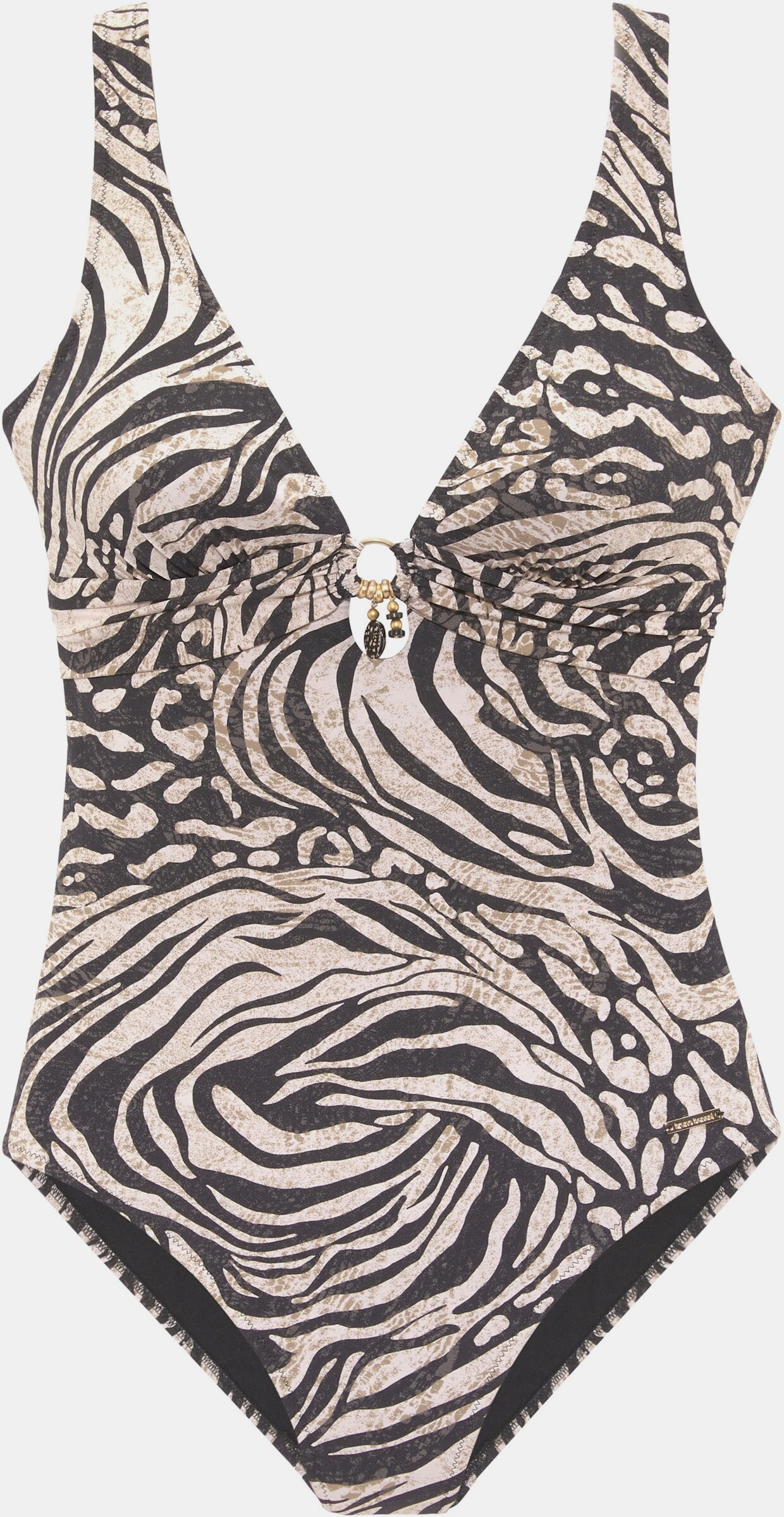 Schöner Badeanzug von Bruno Banani. Modischer Alloverprint mit Metallic-Schimmer und einem Schmuckelement zwischen den Cups. Extratiefer V-Ausschnitt. Shaping-Einsatz vorn. Weiche Microfaser-Qualität.