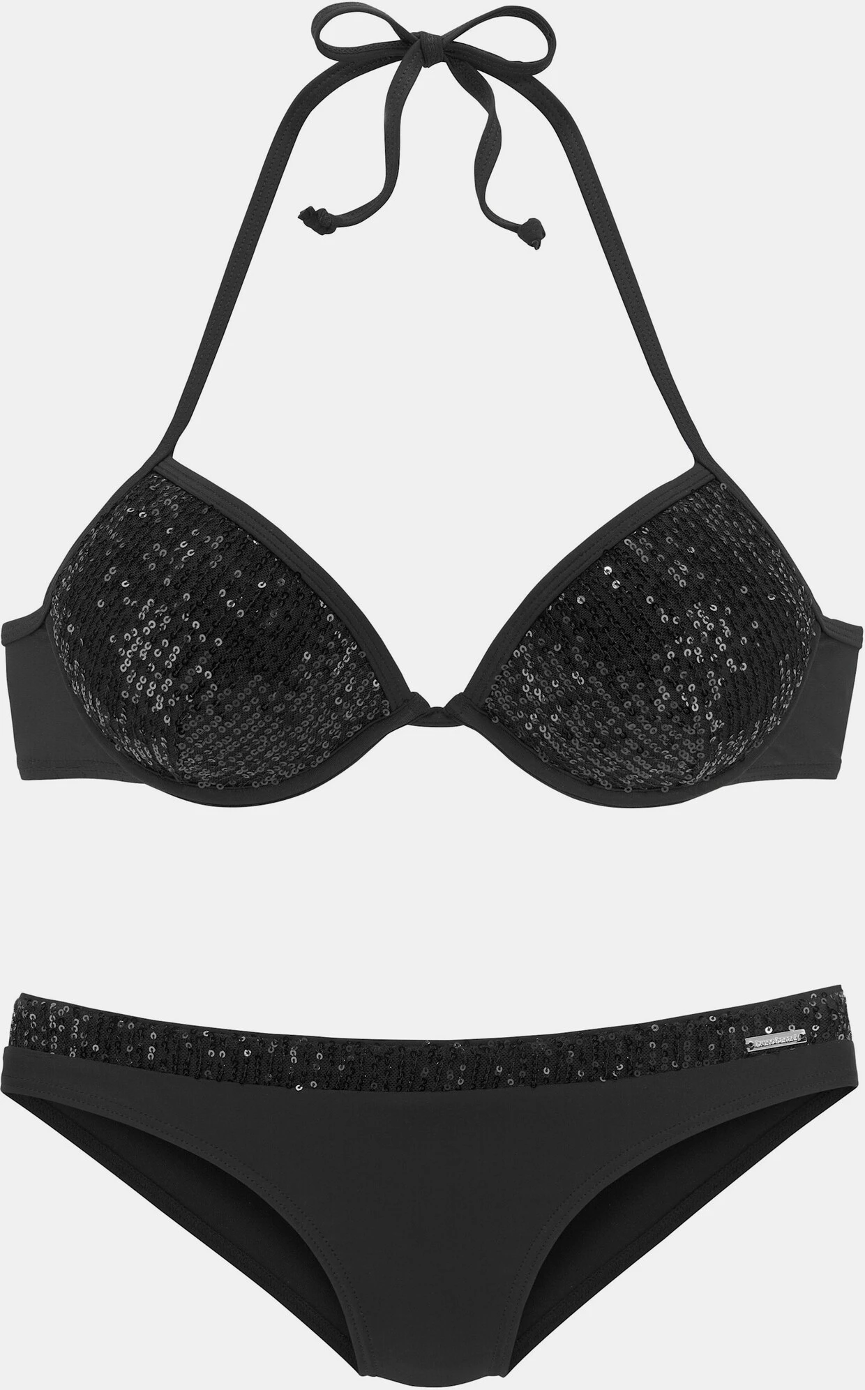 Glitzernder Push-up-Bikini von Bruno Banani. Verziert mit glänzenden Pailletten. Oberteil mit wattierten Cups und integrierter Verstärkung. Klassischer Rückenverschluss. Neckholder-Bindeband. Für ein schillerndes Strandoutfit. Hochelastisches, trageangenehmes Material.