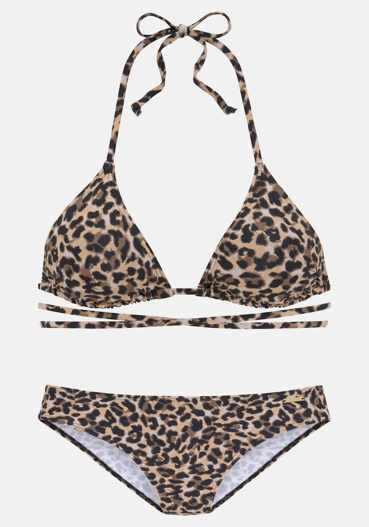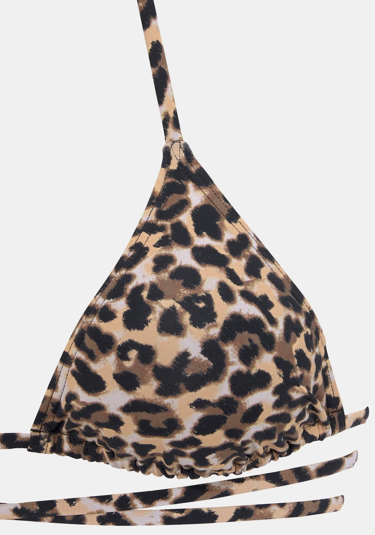 Triangelbikini von Bruno Banani. Allover-Animalprint. Im Nacken und im Rücken zu binden. Zusätzliches Bindeband unterhalb der Brust. Herausnehmbare Cups. Hose in klassischem Design mit kleinem Metallemblem seitlich. Weiche Microfaser.