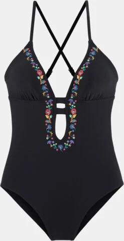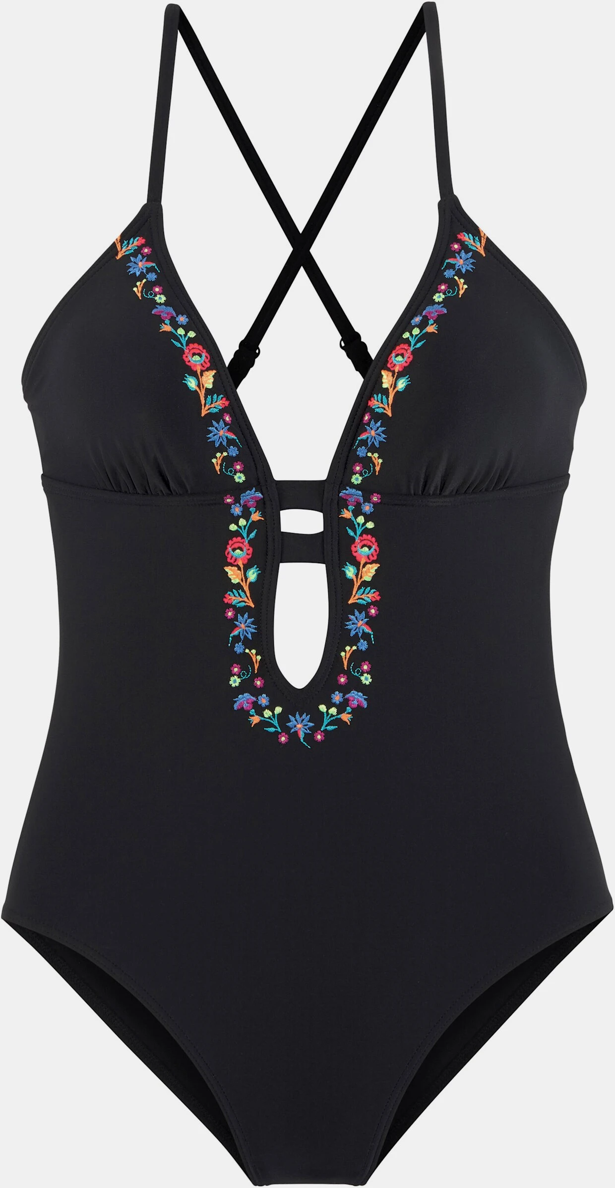 Badeanzug von Buffalo. Unifarbenes Design mit niedlicher Blumenstickerei. Raffiniertes Dekolleté mit tiefem V-Ausschnitt. Tiefer Rückenausschnitt mit gekreuzten, verstellbaren Trägern. Herausnehmbare Softcups. Modisch geschnitten. Angenehme Qualität.