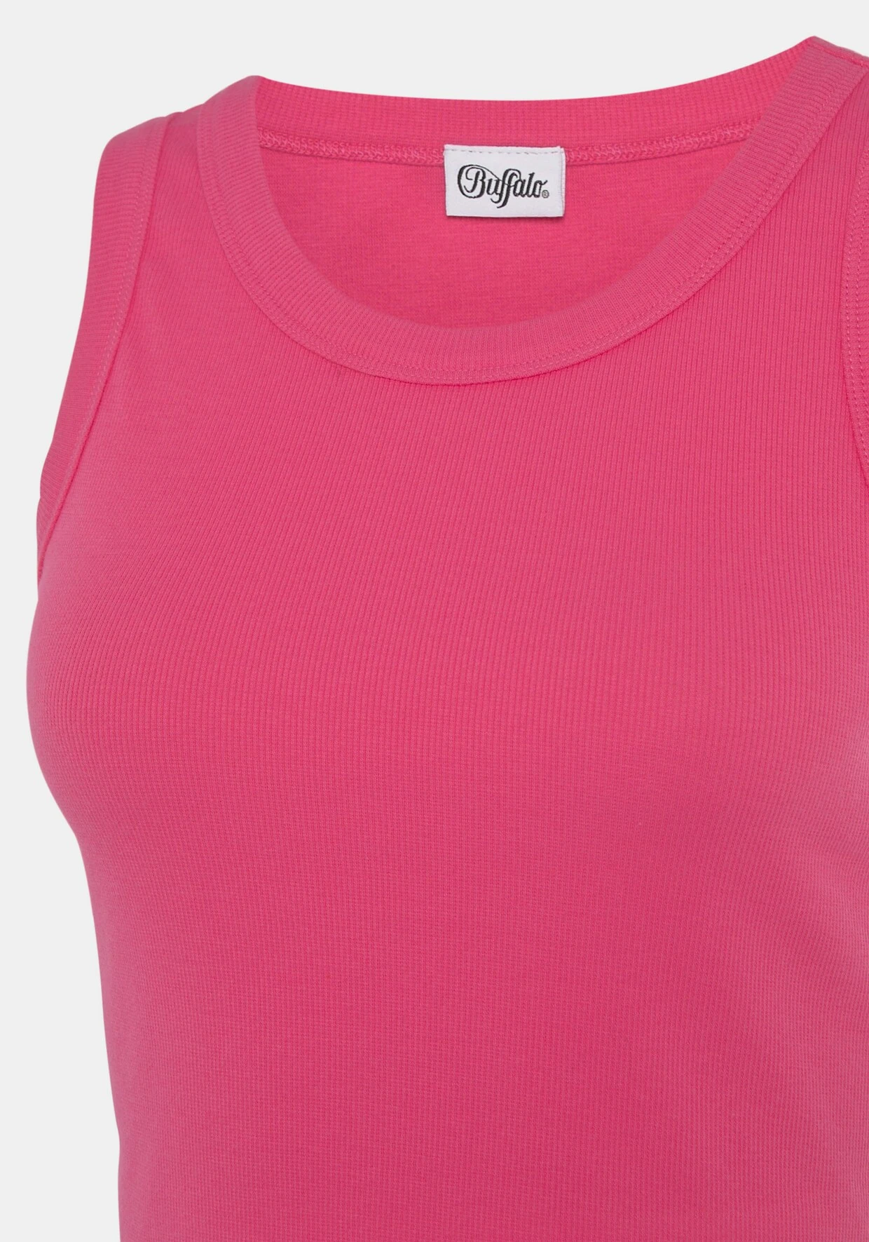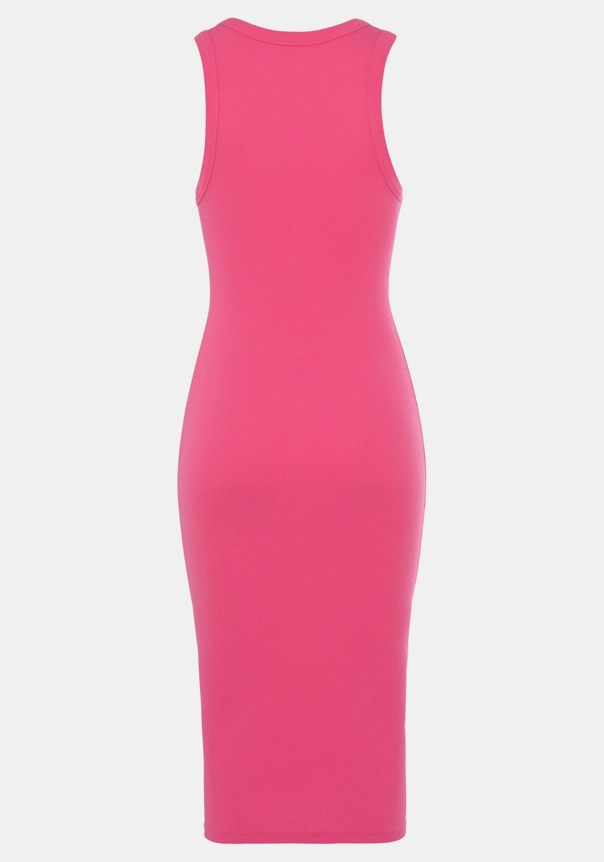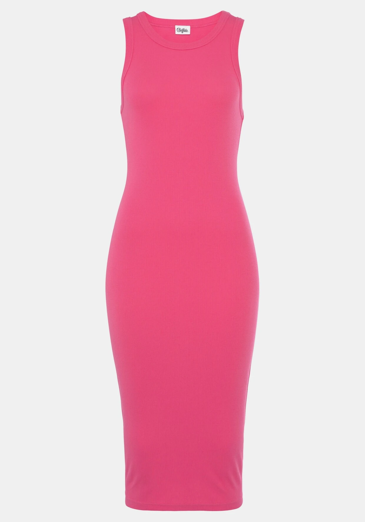 Sehr figurbetont geschnittenes Midikleid von Buffalo. Schlichtes, unifarbenes Design. Rundhalsausschnitt, breite Tanktopträger. Für viele Gelegenheiten. Weiche, elastische Rippware.
