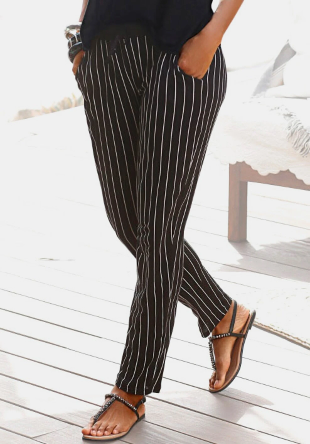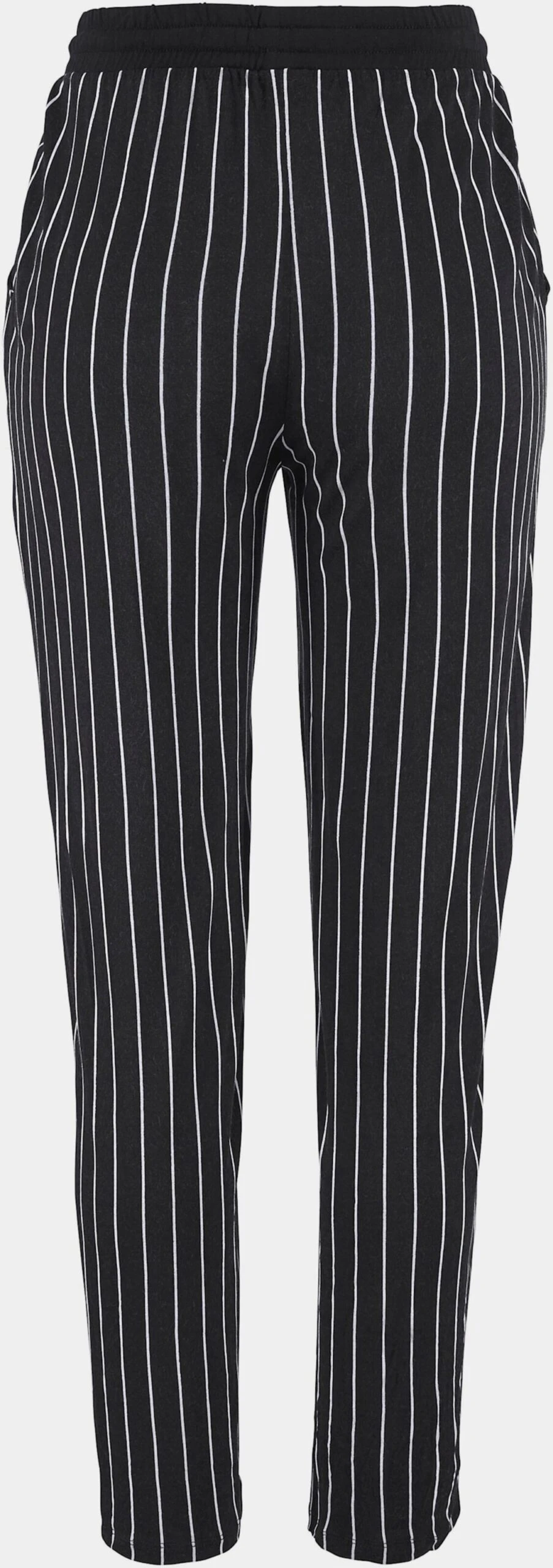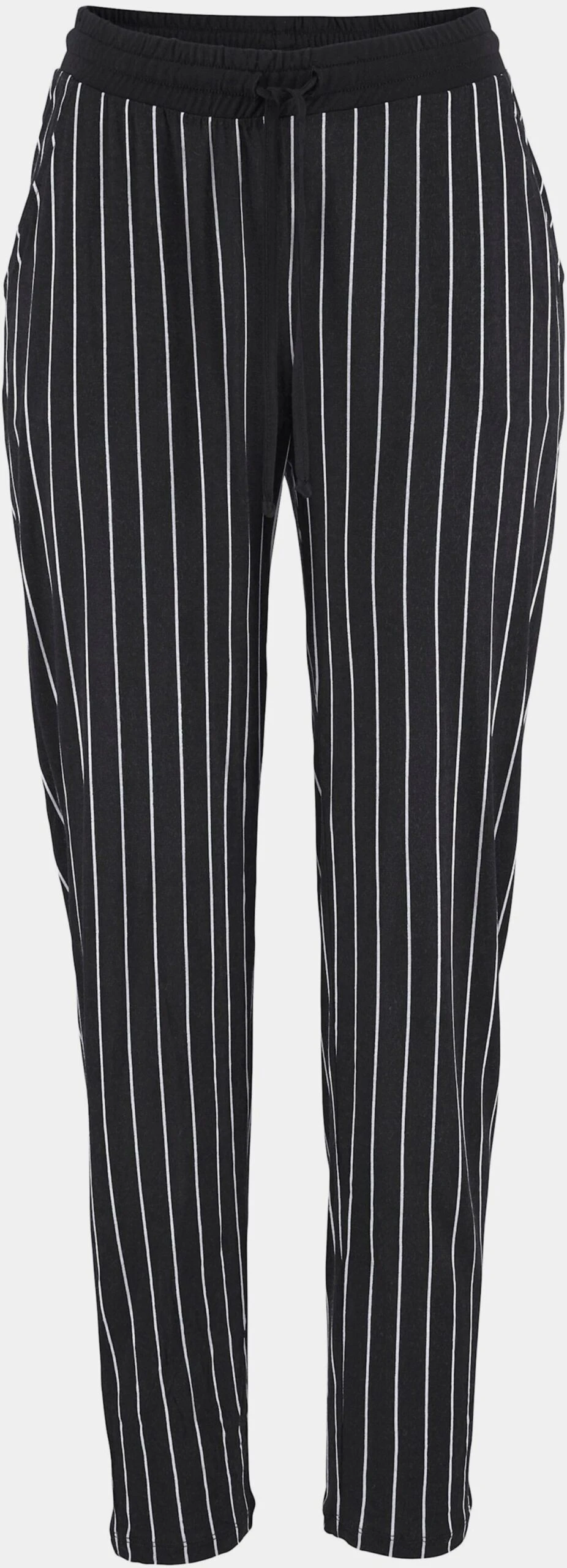 Strandhose mit modischen Schwarz-Weiß-Streifen. Elastischer Bund mit Zierkordel. Seitliche Eingrifftaschen. Innenbeinlänge ca. 73 cm. Leichte und fließende Qualität aus 100% Viskose