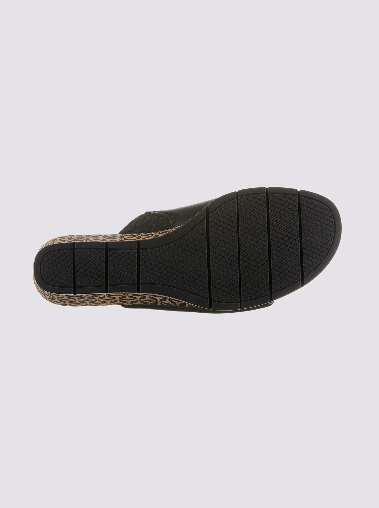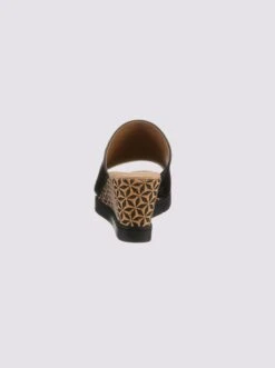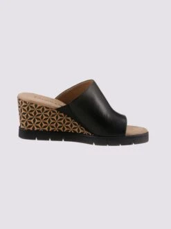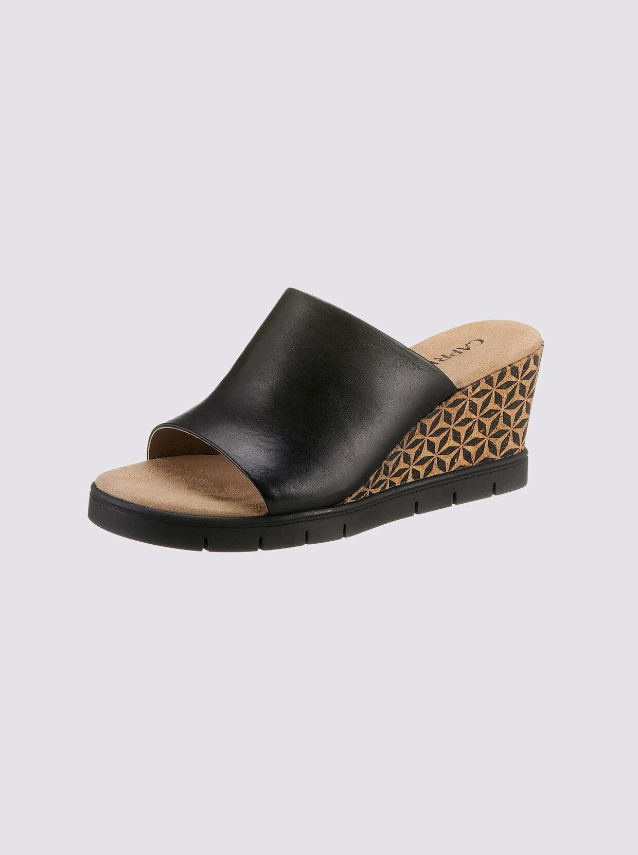 Schicker und bequemer Auftritt garantiert! Pantolette von Caprice mit modisch bedrucktem Keilabsatz und farblich abgesetzter Sohle. Weiche Trittdämpfung. Obermaterial aus Glattleder, Innenausstattung aus Lederimitat und Textil. Flexible TR-Laufsohle mit ca. 70 mm Absatz. Weite G.