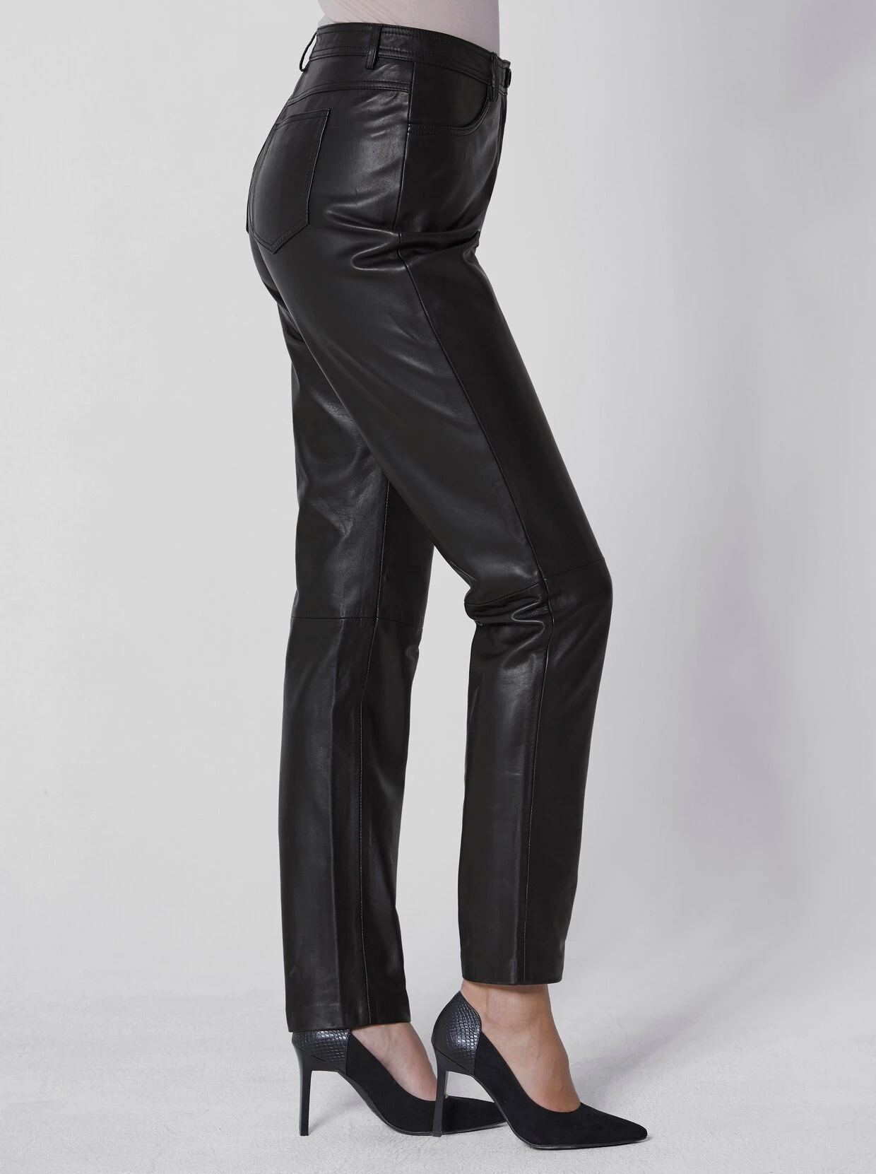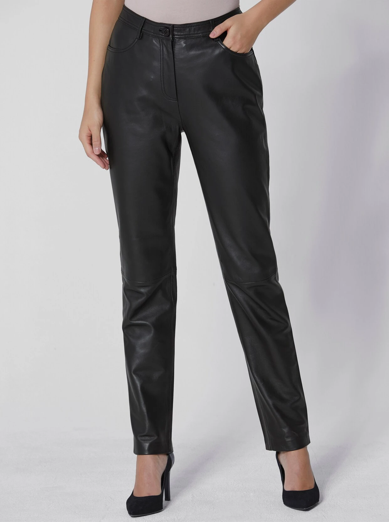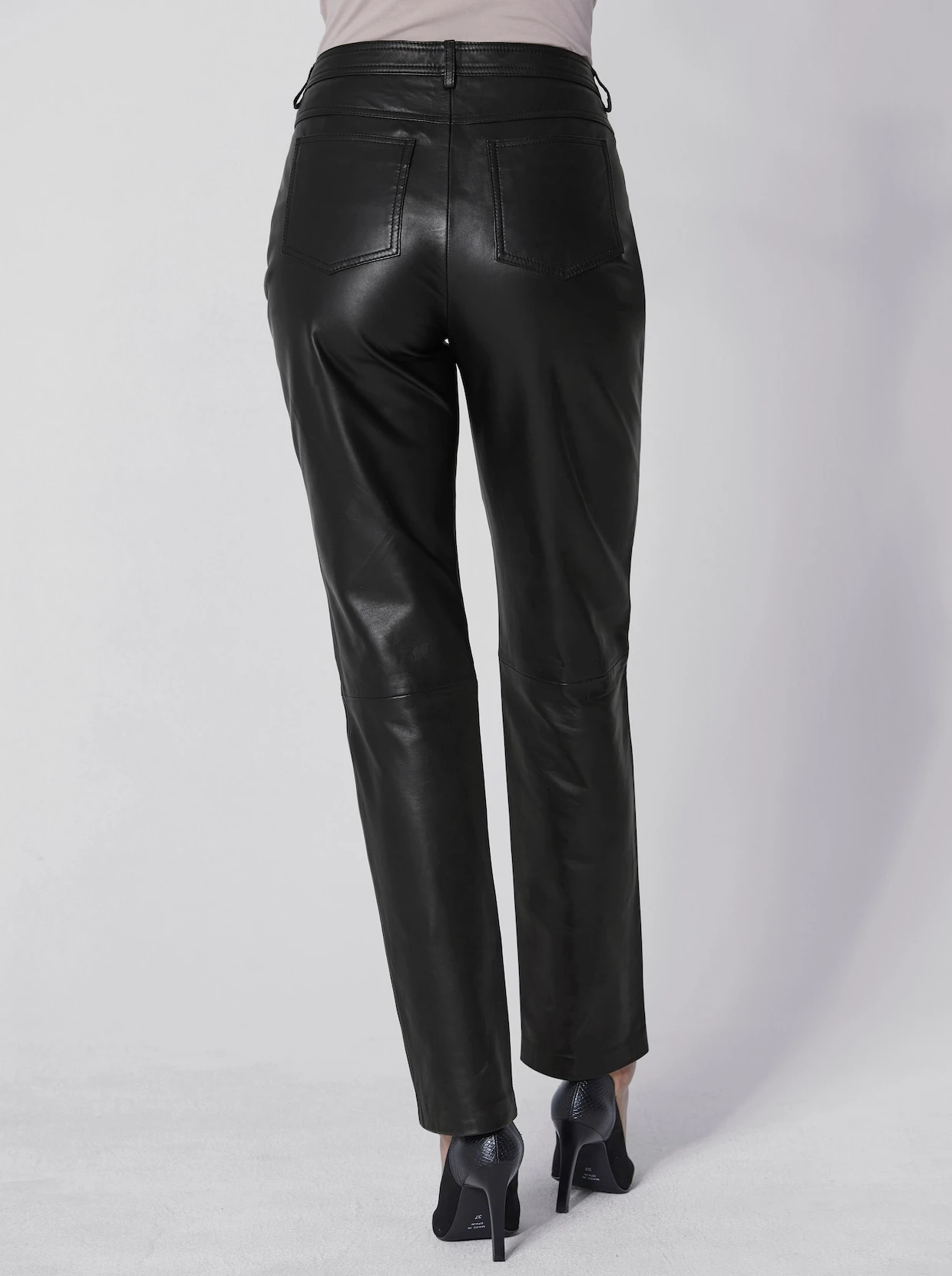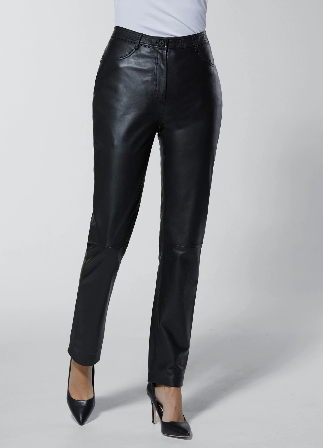 Sie suchen eine topmodische Wunderwaffe für jeden Tag? Dank Formbund, Knopf und vorderem Reißverschluss schlüpfen Sie mühelos in diese wunderbar weiche Lammnappa-Lederhose. Eine Teilungsnaht in Kniehöhe gibt Formstabilität; das Futter bis zum Knie erhöht den Tragekomfort. Gürtelschlaufen, abgerundete Vordertaschen, aufgesetzte Gesäßtaschen und eine Teilungsnaht hinten perfektionieren den entspannten Look. Ohne Gürtel. Fußweite ca. 38 cm.