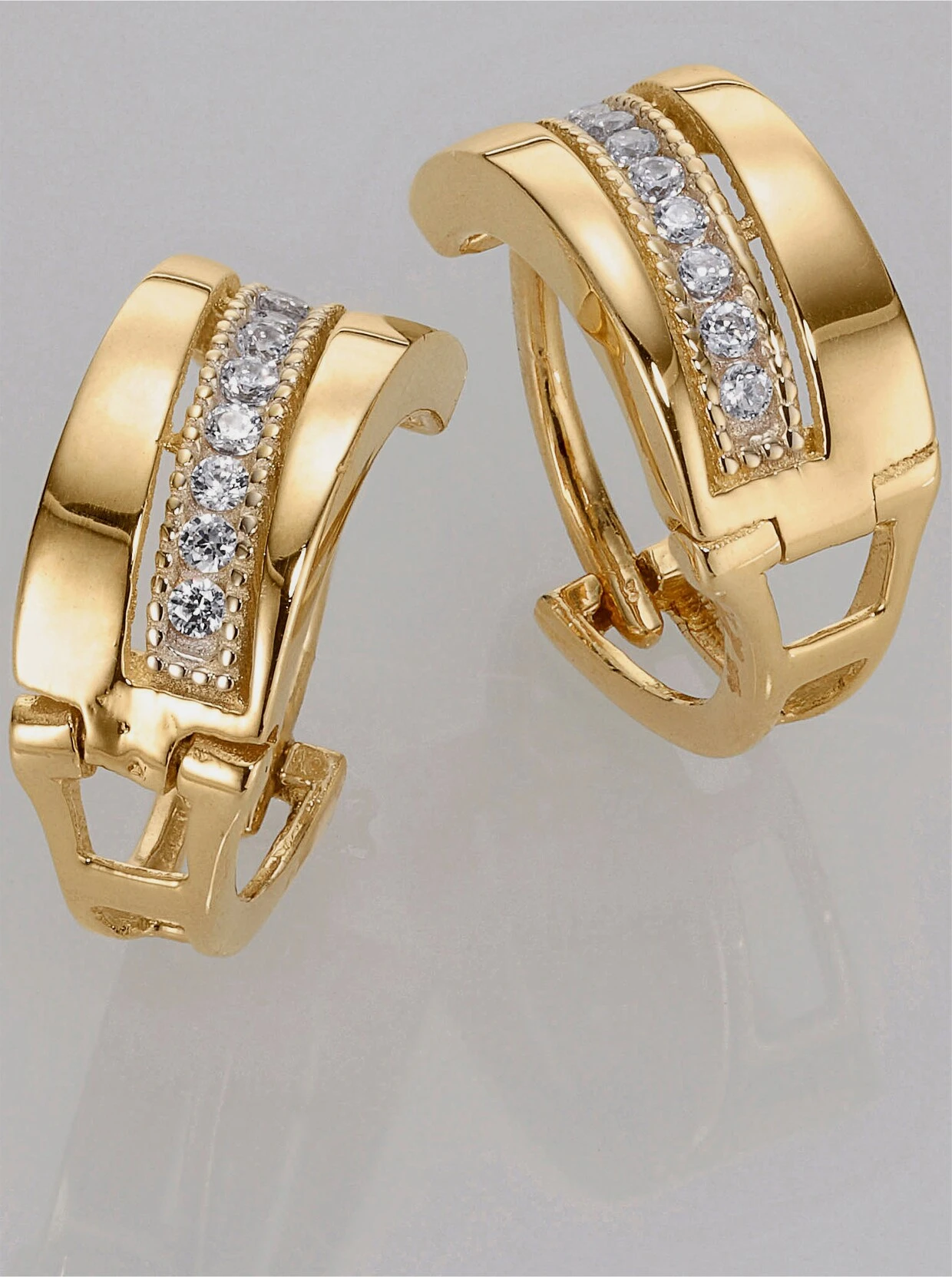 Elegante Creolen mit praktischem Klappmechanismus aus 375er Gold, rhodiniert, mit funkelnden Zirkonia. Glanz-Qualität.
