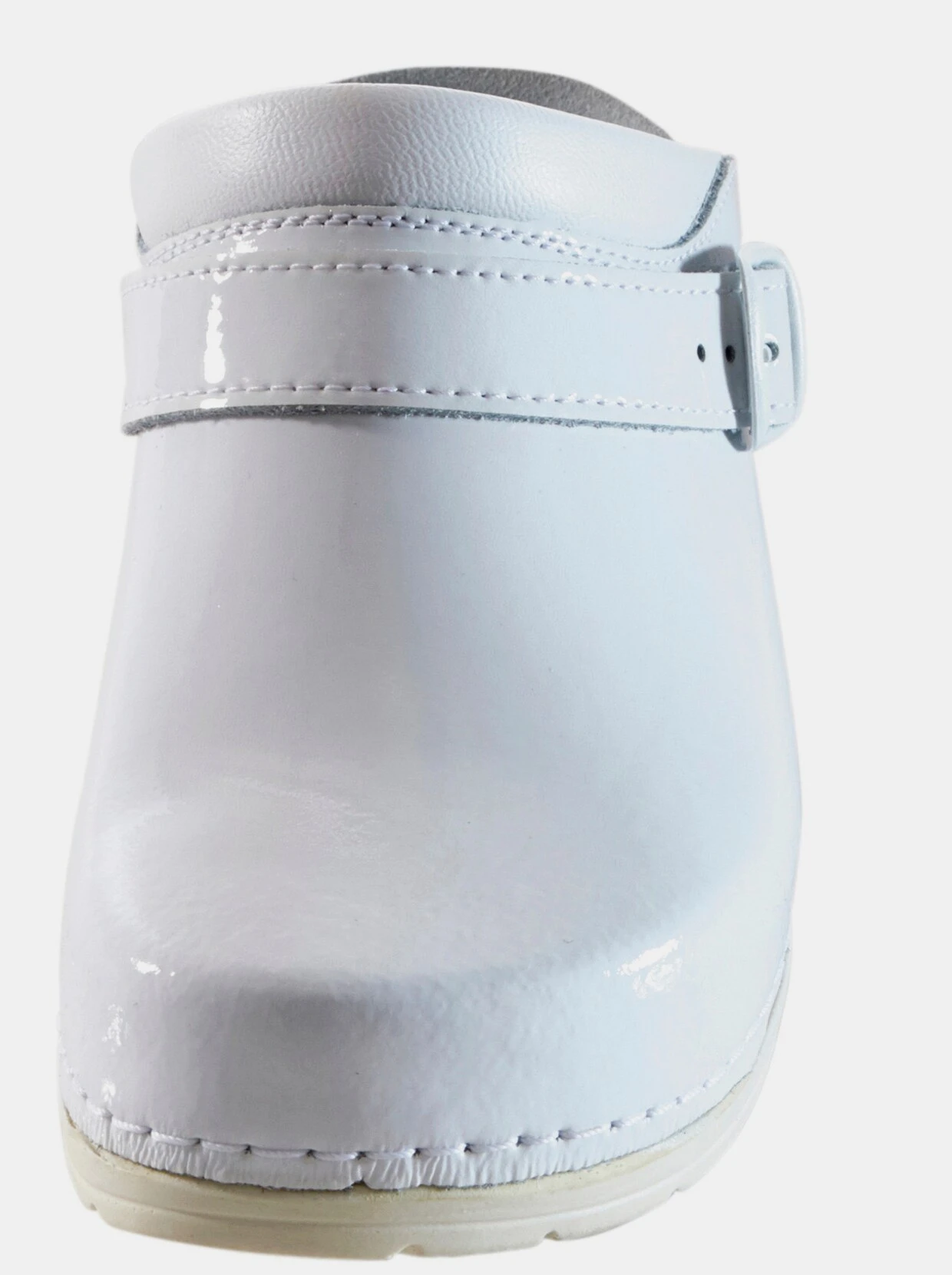 Clog Aus Rind-Lackleder. Weite G: mehr Volumen im Zehen-, Ballen- und Ristbereich. Anatomisch geformtes Fußbett. Innensohle: Leder. Absatz mit Korkbezug, Höhe ca. 80 mm.