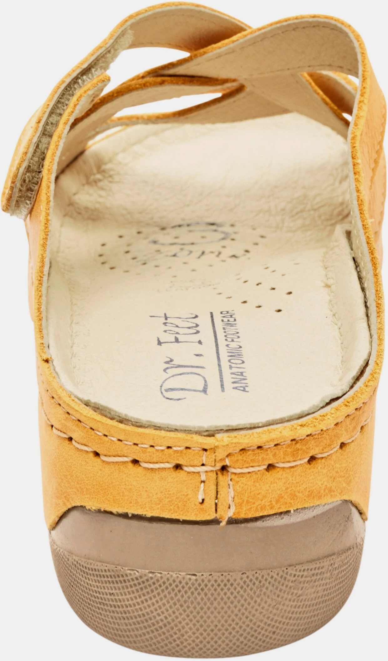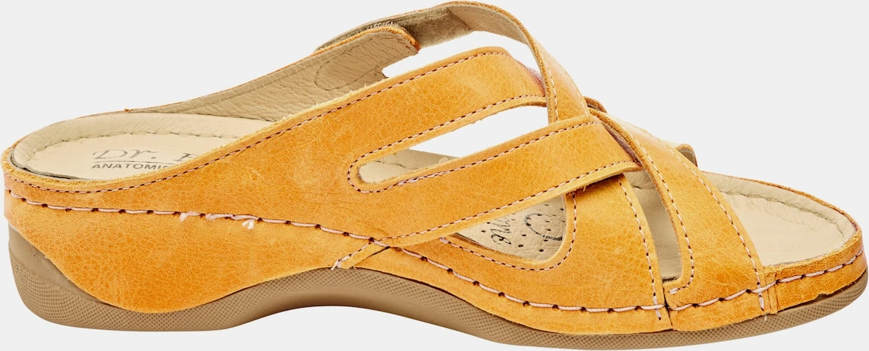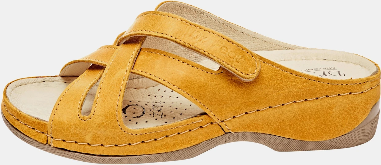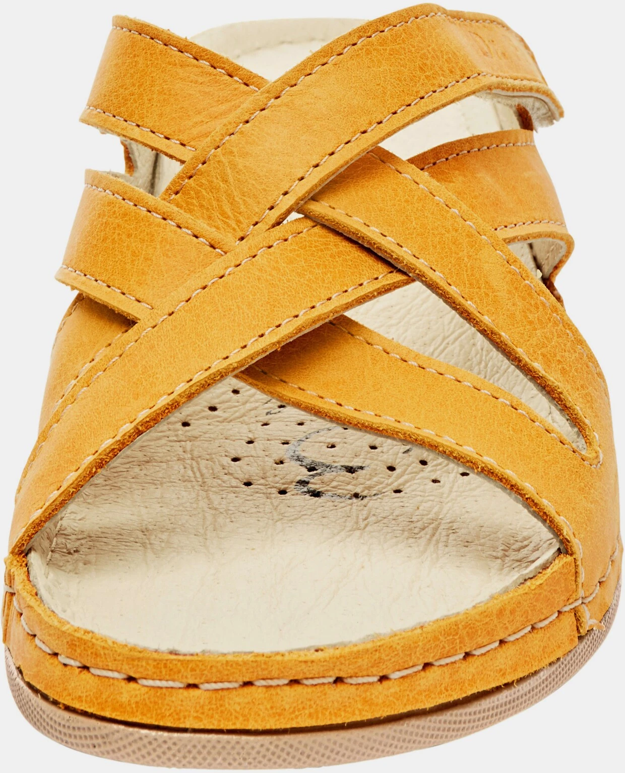 Hausschuhe Hochwertige Damenhausschuhe aus Rindleder. Mit Lederdecksohle. Ein Riemchen mit Klettverschluss. Leichter 40-mm-Absatz. Anatomisch geformtes Fußbett.