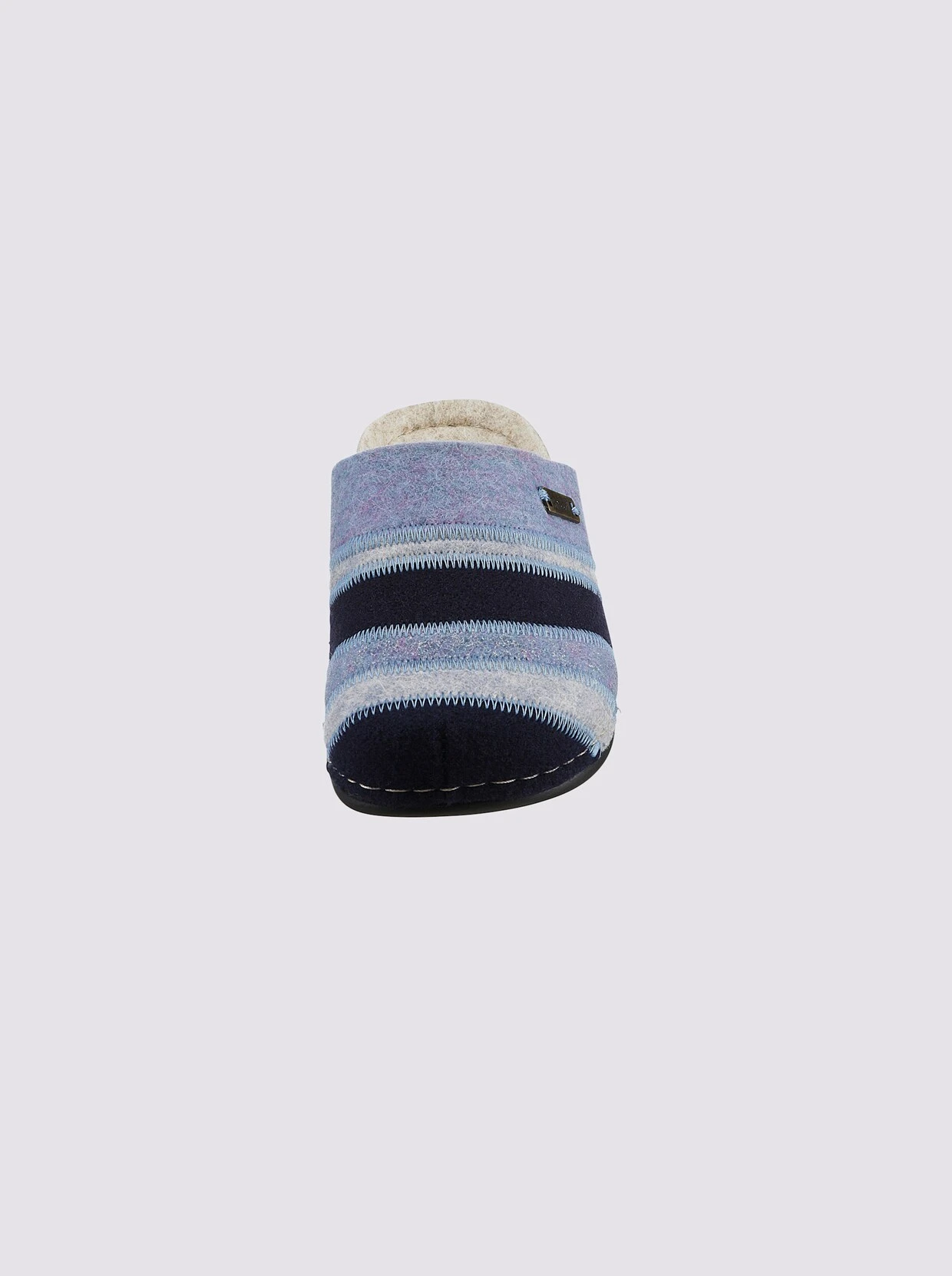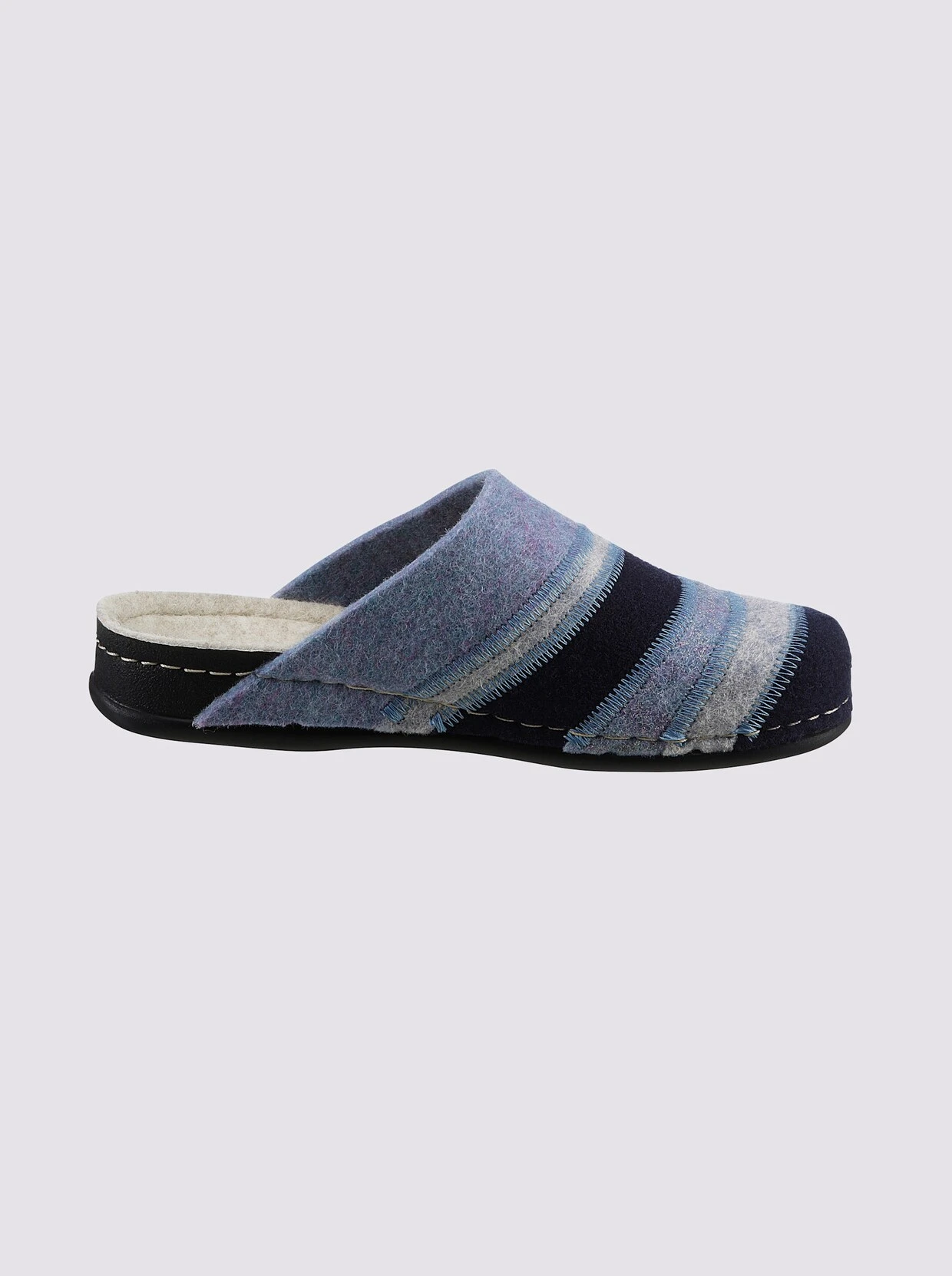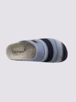 Pantoffel von Dr. Feet im modischen Streifen-Dessin. Wohlfühl-Qualität aus Wolle und Polyester, innen aus Filz und Wolle. Weich gepolstert und herrlich leicht. Flexible PU-Laufsohle mit ca. 30 mm Absatz. Weite H.