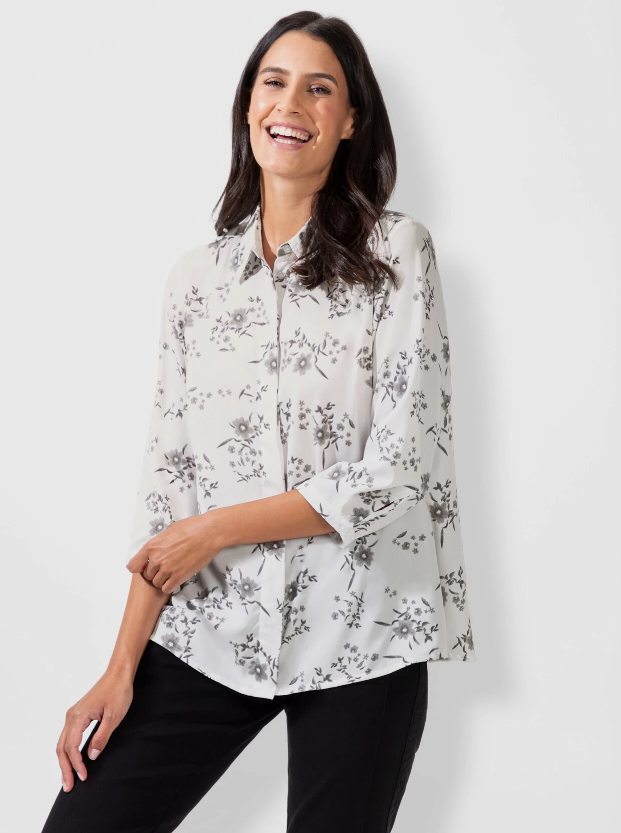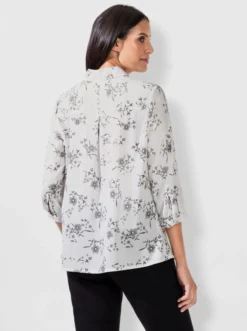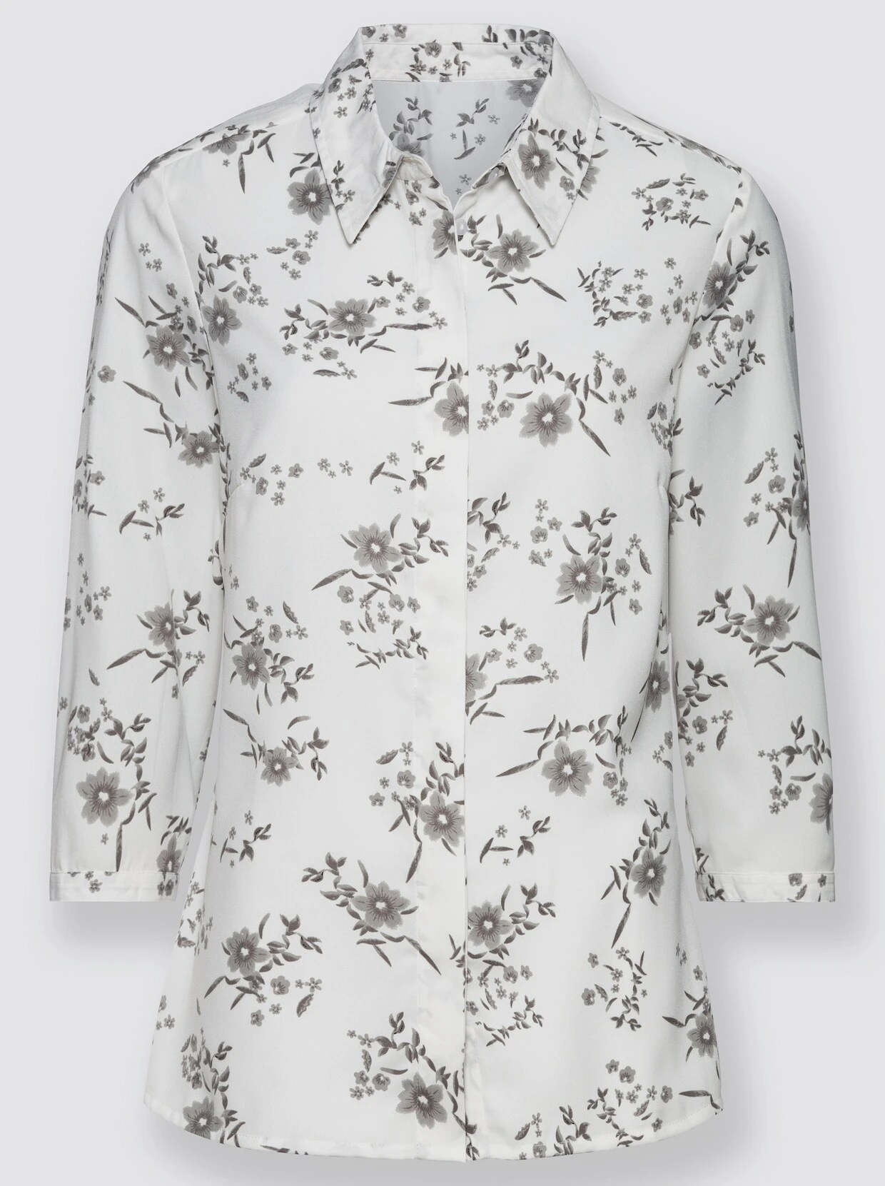 Das charmante, florale Dessin verleiht der Bluse die edle Optik. Die etwas längere Form und die leichte A-Linie machen sie zum Figurschmeichler. Mit Hemdkragen, verdeckter Knopfleiste und 3/4-Ärmeln mit Knopfmanschette.