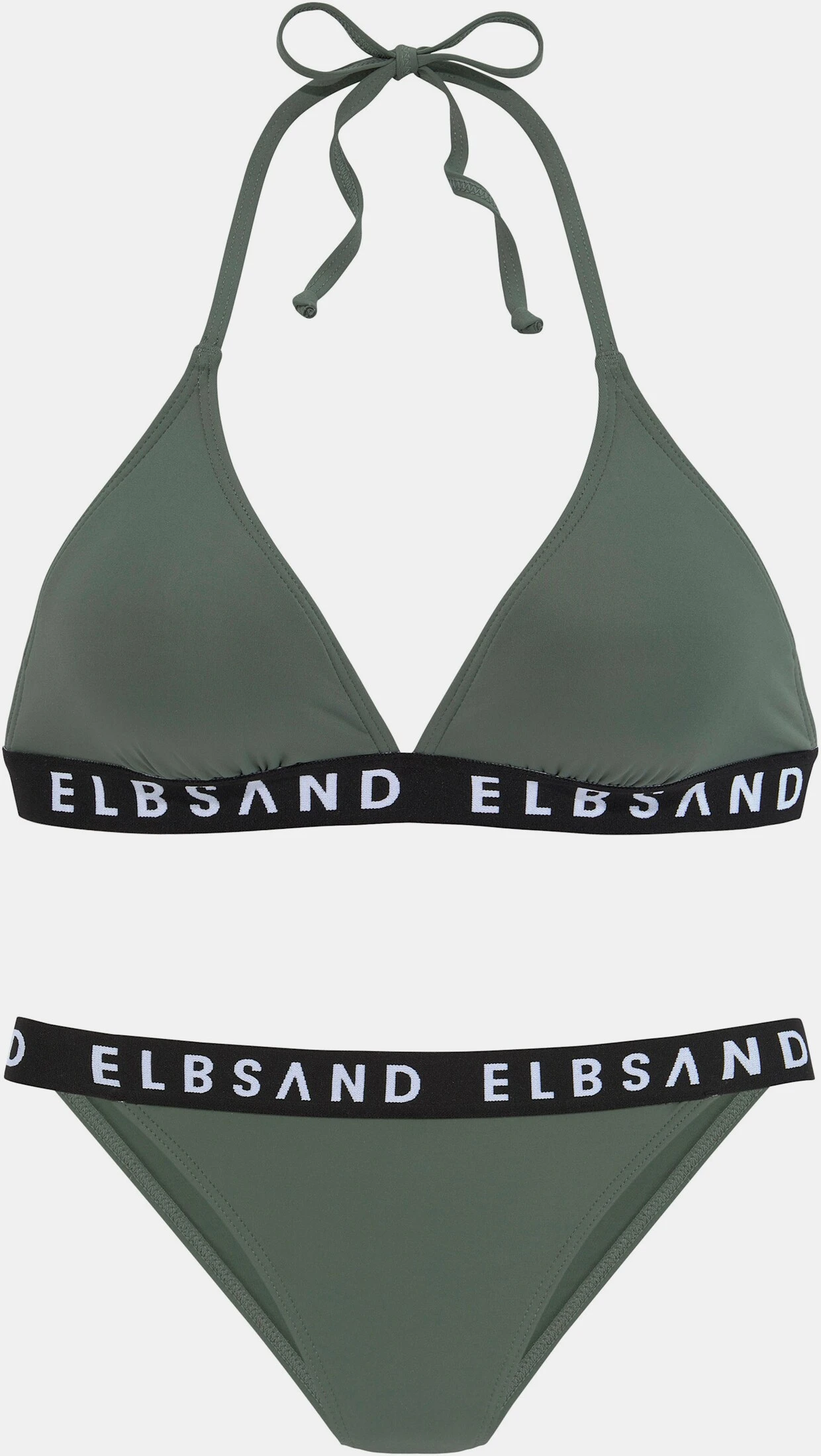 Sportlicher Triangel-Bikini von Elbsand. Hingucker: elastisches Band mit Markenschriftzug an Top und Hose. Cups herausnehmbar. Neckholder. Bikinihose etwas knapper geschnitten. Ideal für den Strandurlaub. Trageangenehmes Material.