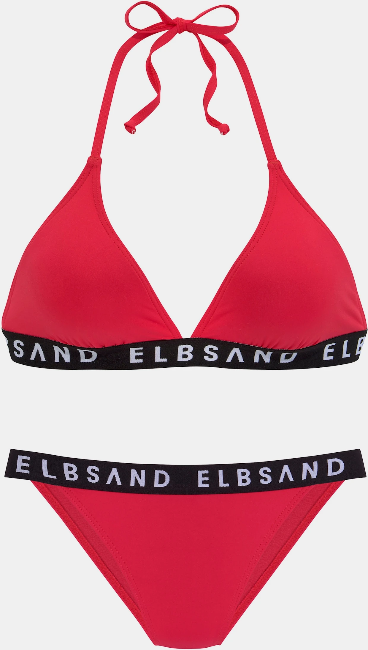 Sportlicher Triangel-Bikini von Elbsand. Hingucker: elastisches Band mit Markenschriftzug an Top und Hose. Cups herausnehmbar. Neckholder. Bikinihose etwas knapper geschnitten. Ideal für den Strandurlaub. Trageangenehmes Material.