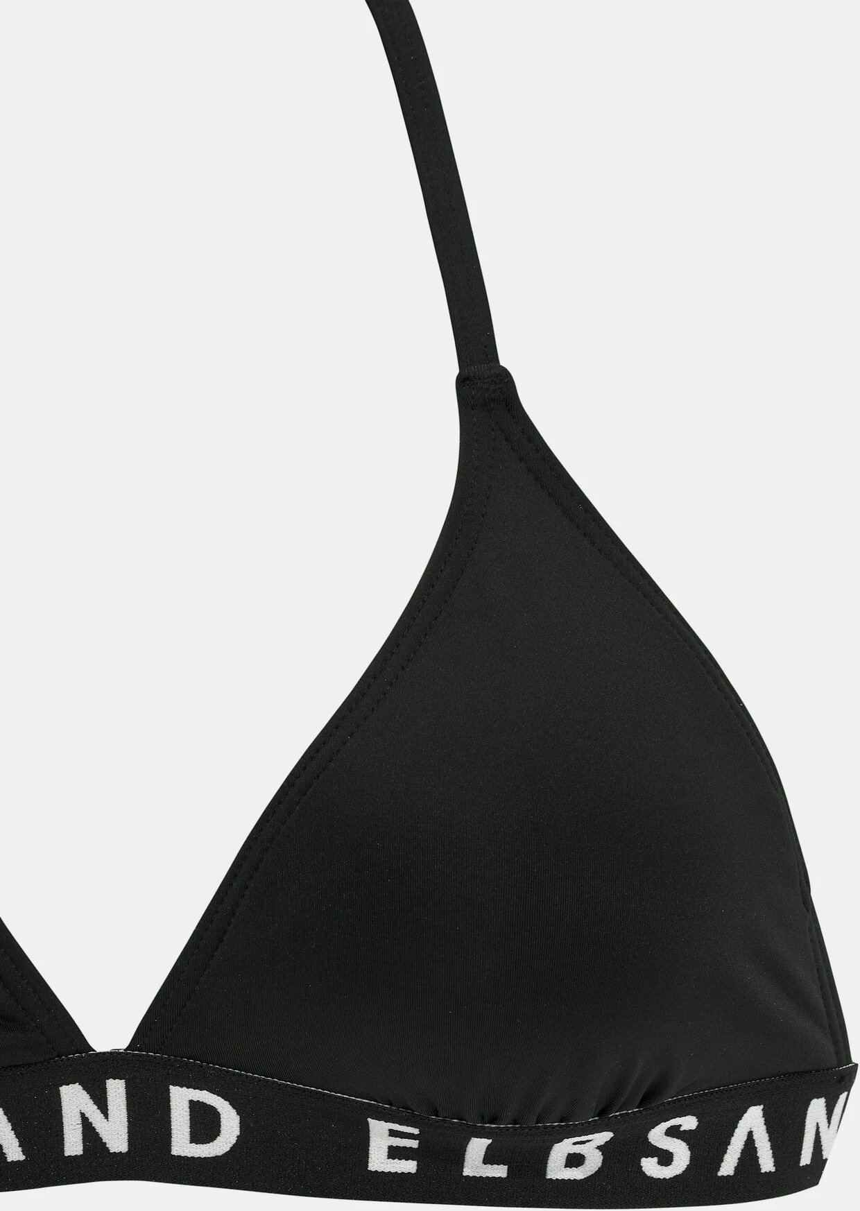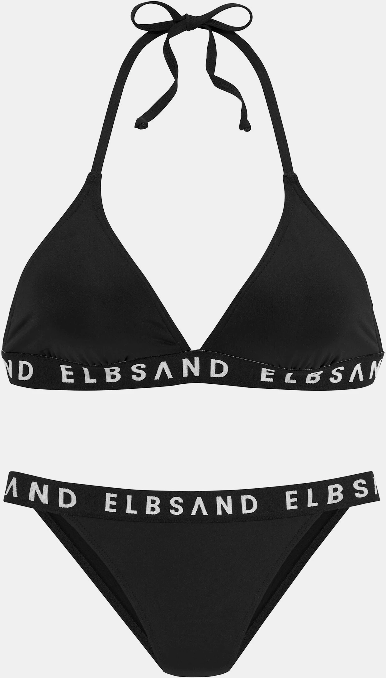 Sportlicher Triangel-Bikini von Elbsand. Hingucker: elastisches Band mit Markenschriftzug an Top und Hose. Cups herausnehmbar. Neckholder. Bikinihose etwas knapper geschnitten. Ideal für den Strandurlaub. Trageangenehmes Material.