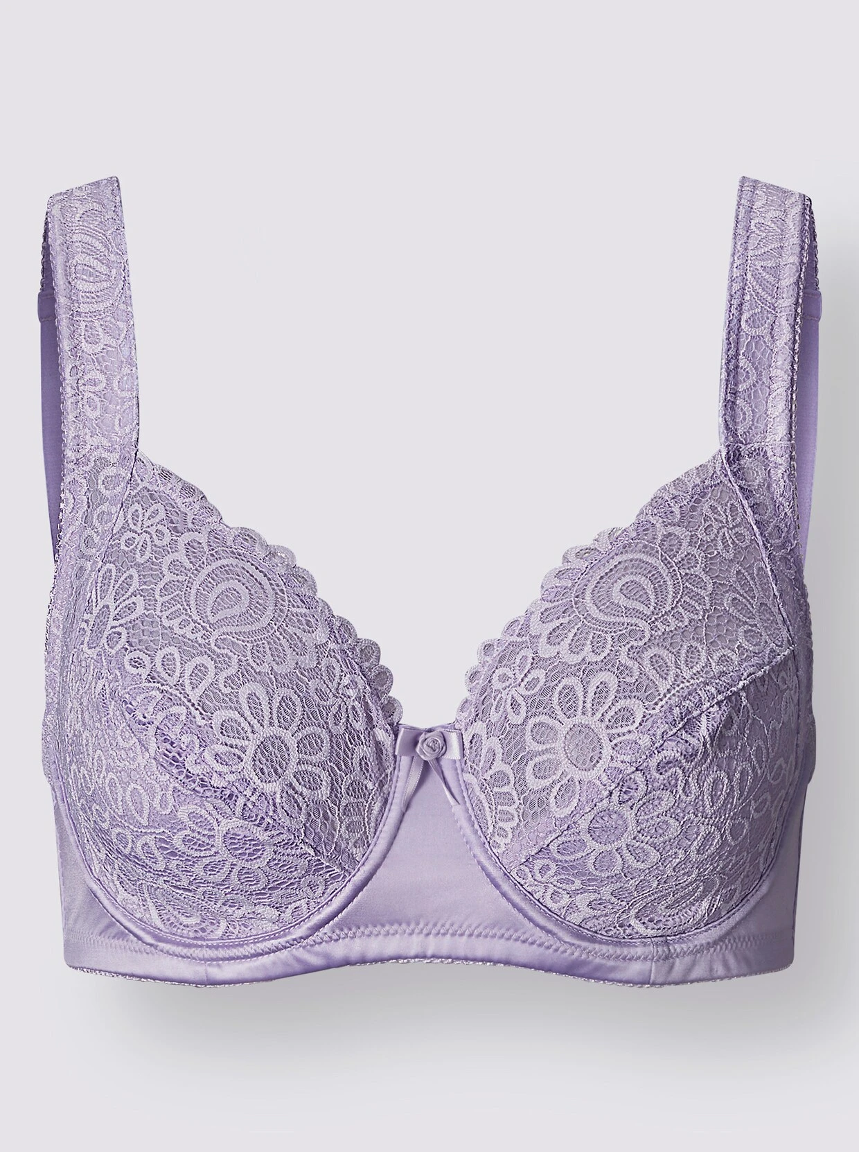 Die 2-geteilten Cups aus filigraner Spitze, die bis in die im Rücken verstellbaren, gepolsterten Träger reicht, machen diesen Entlastungs-BH mit Bügel zu einem wahren Frauenschwarm. Denn die Obercups lassen leicht die Haut durchschimmern. Die Untercups sind blickdicht unterlegt.