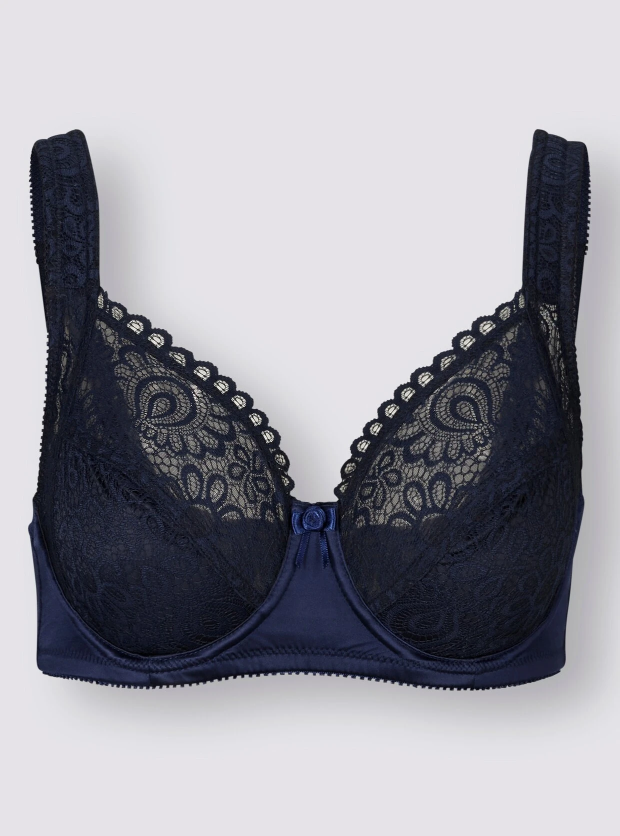 Die 2-geteilten Cups aus filigraner Spitze, die bis in die im Rücken verstellbaren, gepolsterten Träger reicht, machen diesen Entlastungs-BH mit Bügel zu einem wahren Frauenschwarm. Denn die Obercups lassen leicht die Haut durchschimmern. Die Untercups sind blickdicht unterlegt.