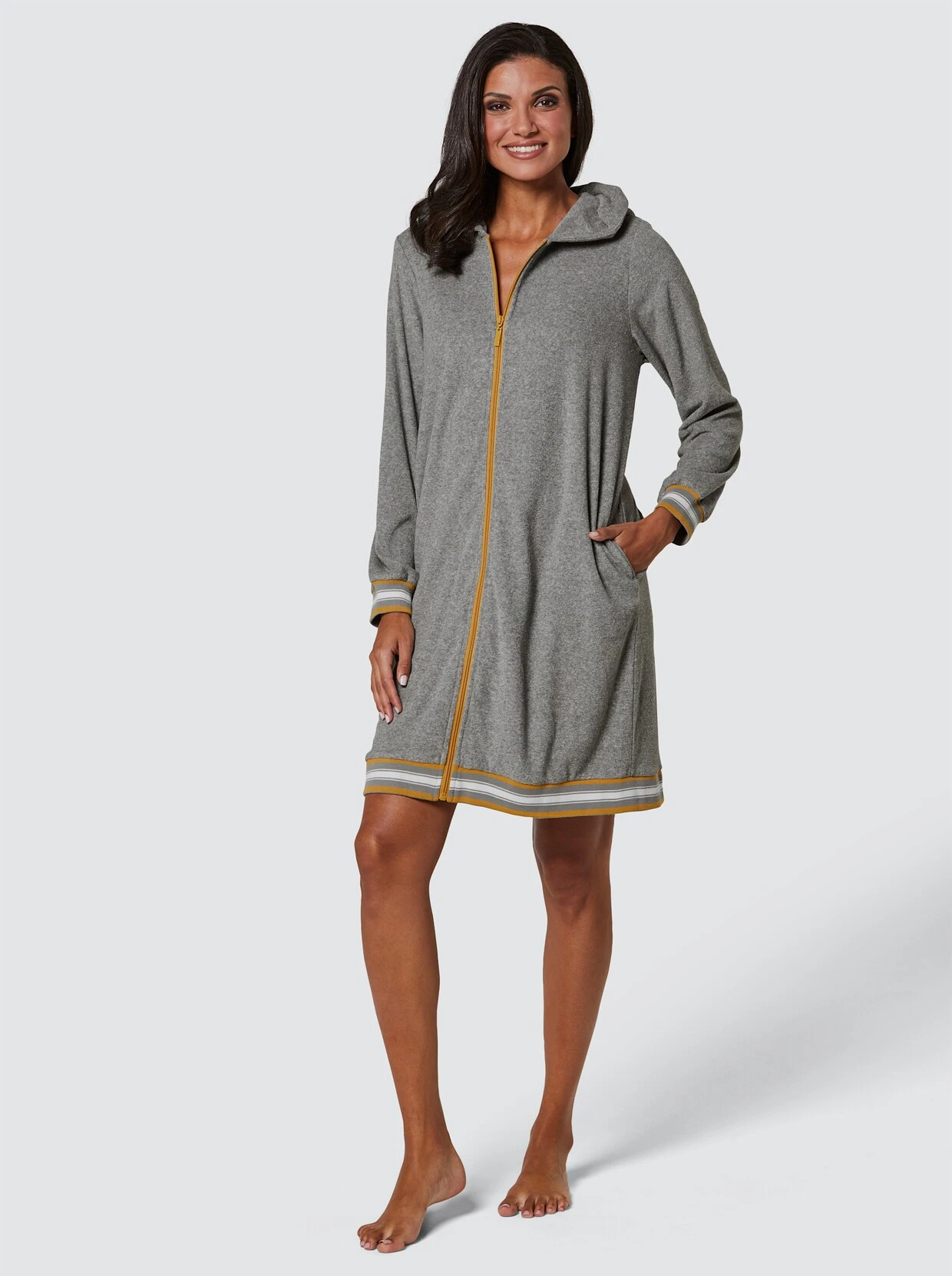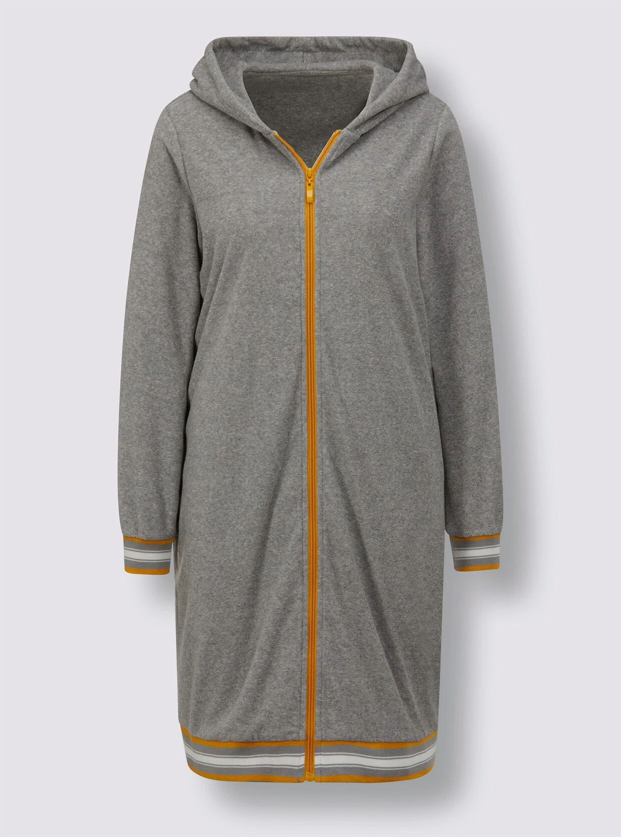 Von feel good! Bademantel in Leichtfrottee-Qualität mit gefütterter Kapuze und durchgehendem, kontrastfarbigem Reißverschluss. 2 seitliche Taschen. Elastische, gestreifte Ripp-Bündchen an den Ärmeln und am Saum.