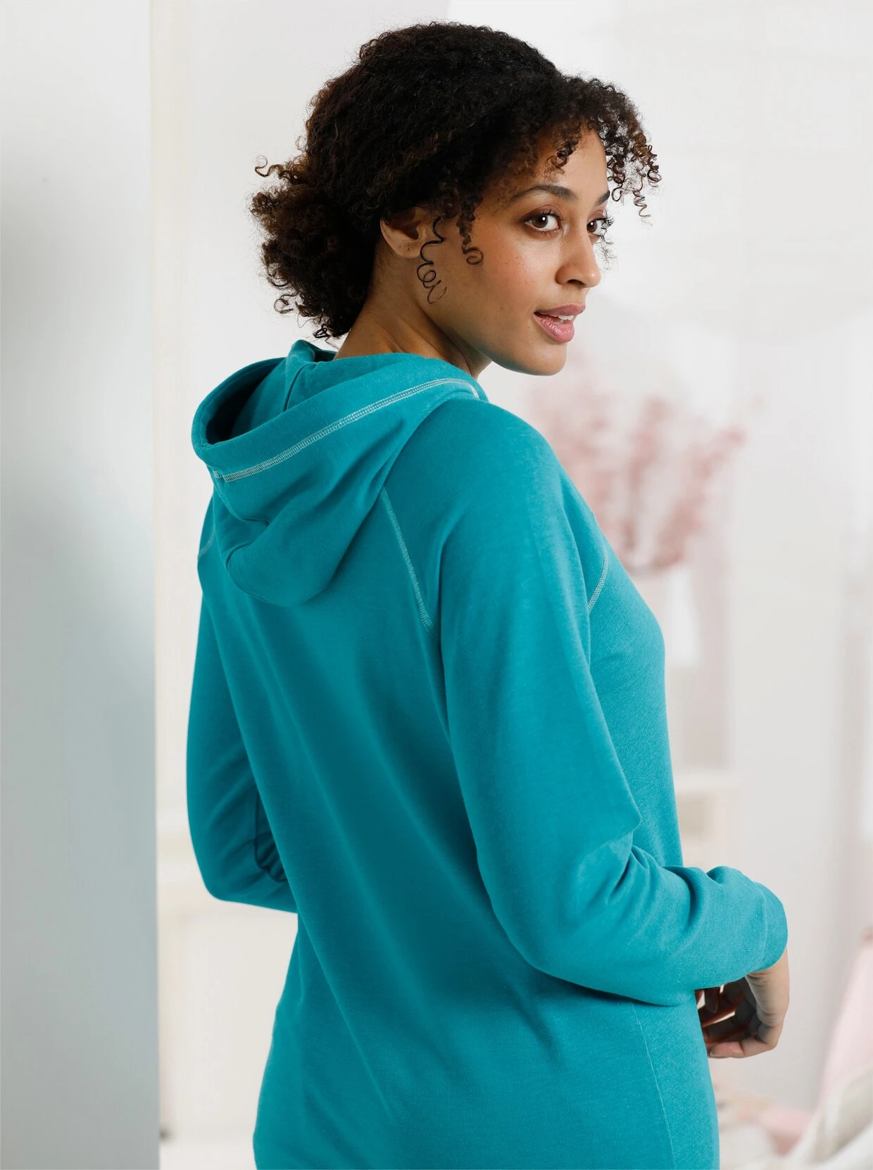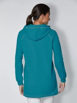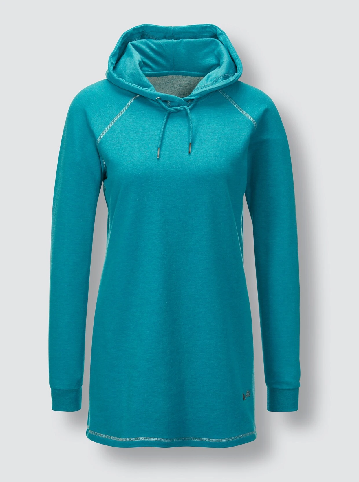 Reinschlüpfen, wohlfühlen! Longshirt von feel good in bequemer Sweat-Qualität mit glitzernden Ziernähten. Kapuze mit Tunnelzug und Bindeband und elastische Bündchen an den Abschlüssen der langen Ärmel.