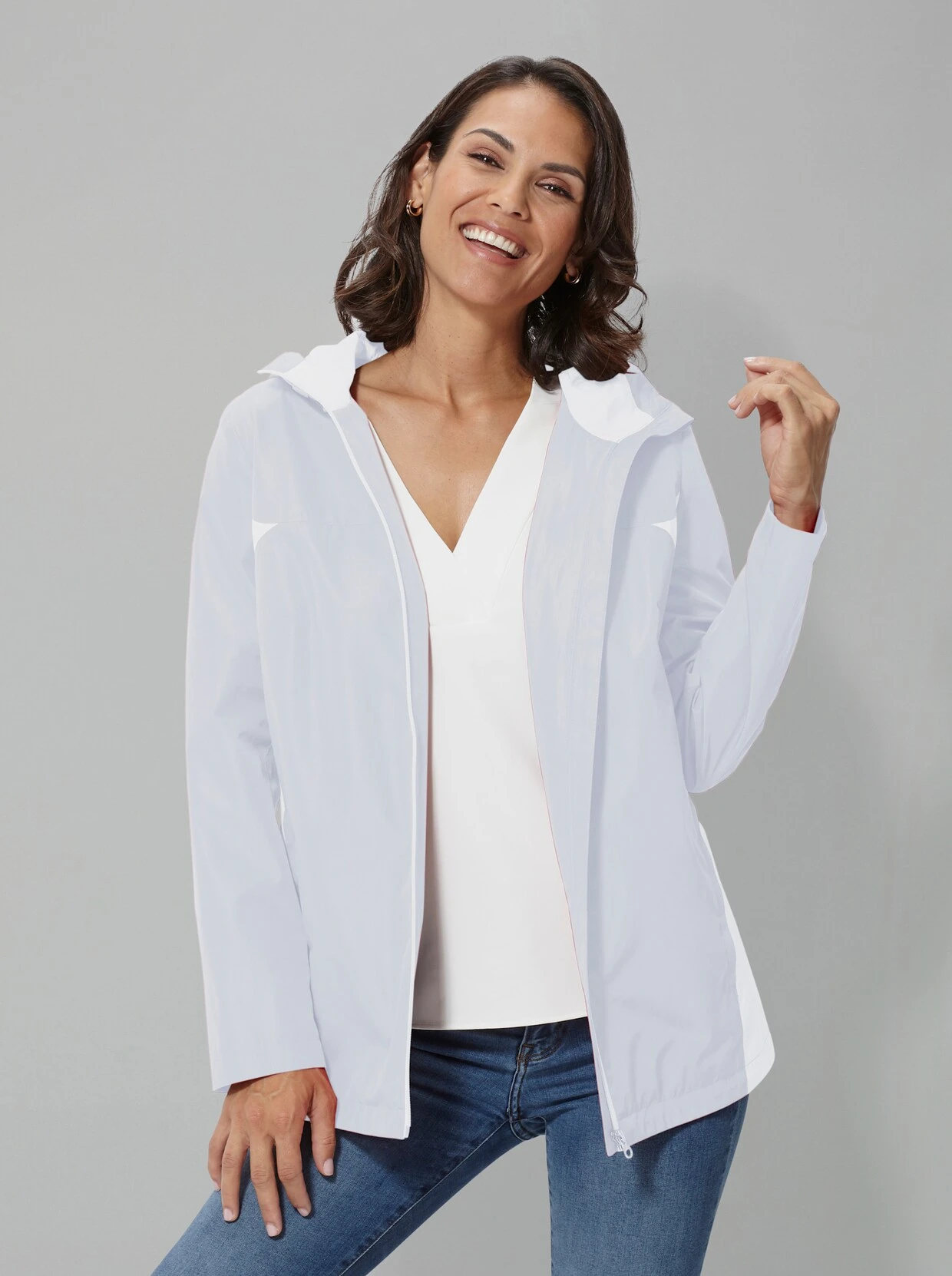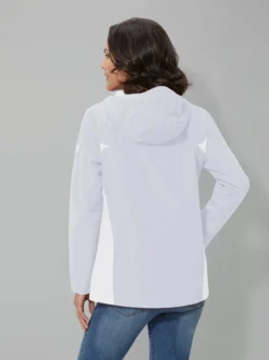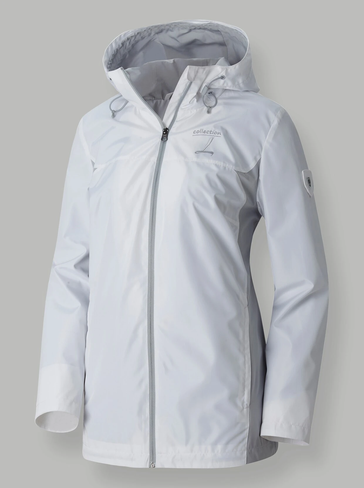 Sportive Funktionsjacke mit modischen Akzenten: streckende, seitliche Einsätze und Krageninnenseite in kontrastreichem Grau. Links mit dezentem „collection L“Schriftzug im Brustbereich und auf der Applikation am Ärmel. Stehkragen mit Kapuze und durchgehendem Reißverschluss. 2 Reißverschluss-Taschen sowie 1 Innentasche.