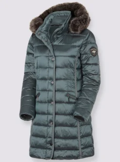 Der Winter kann kommen! Und mit diesem wunderbar wärmenden Mantel sind Sie immer wohlig warm eingepackt! In Green-Goose-Qualität, d.h. die Funktionsfaser fühlt sich zwar an wie echte Daune, ist aber viel pflegeleichter, maschinenwaschbar und schnell trocknend. Der hochwertige Pelzimitat-Kragen an der Kapuze kann ganz einfach abgeknöpft werden, die Kapuze selbst ist durch einem abzippbaren Reißverschluss mit der Jacke verbunden. Mit Tunnelzug und Stopper in der Weite regulierbar. Verdeckter 2-Wege-Reißverschluss mit zusätzlicher Druckknopfleiste. Winddicht dank des Gummizugs am Ärmelabschluss. 2 Reißverschluss-Taschen.