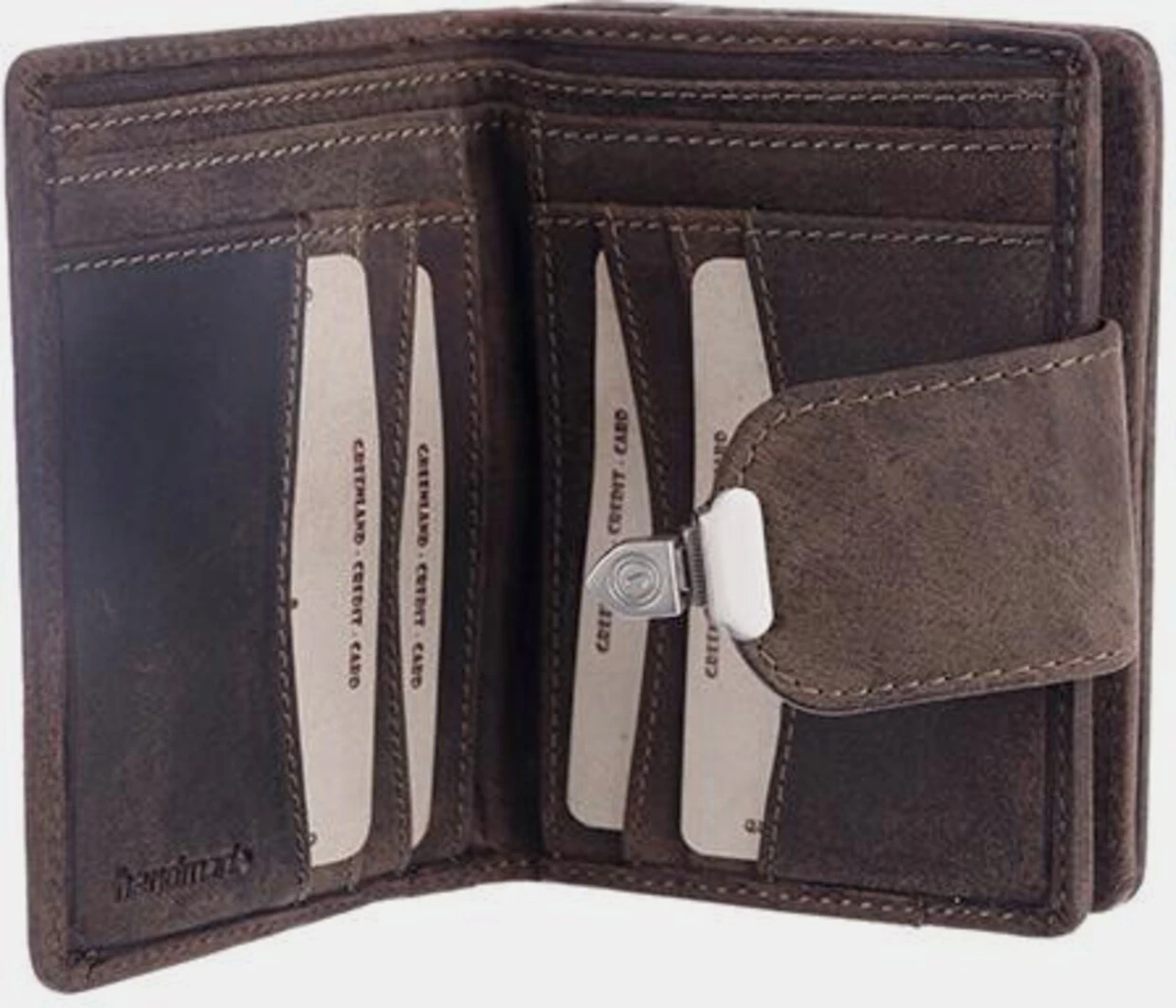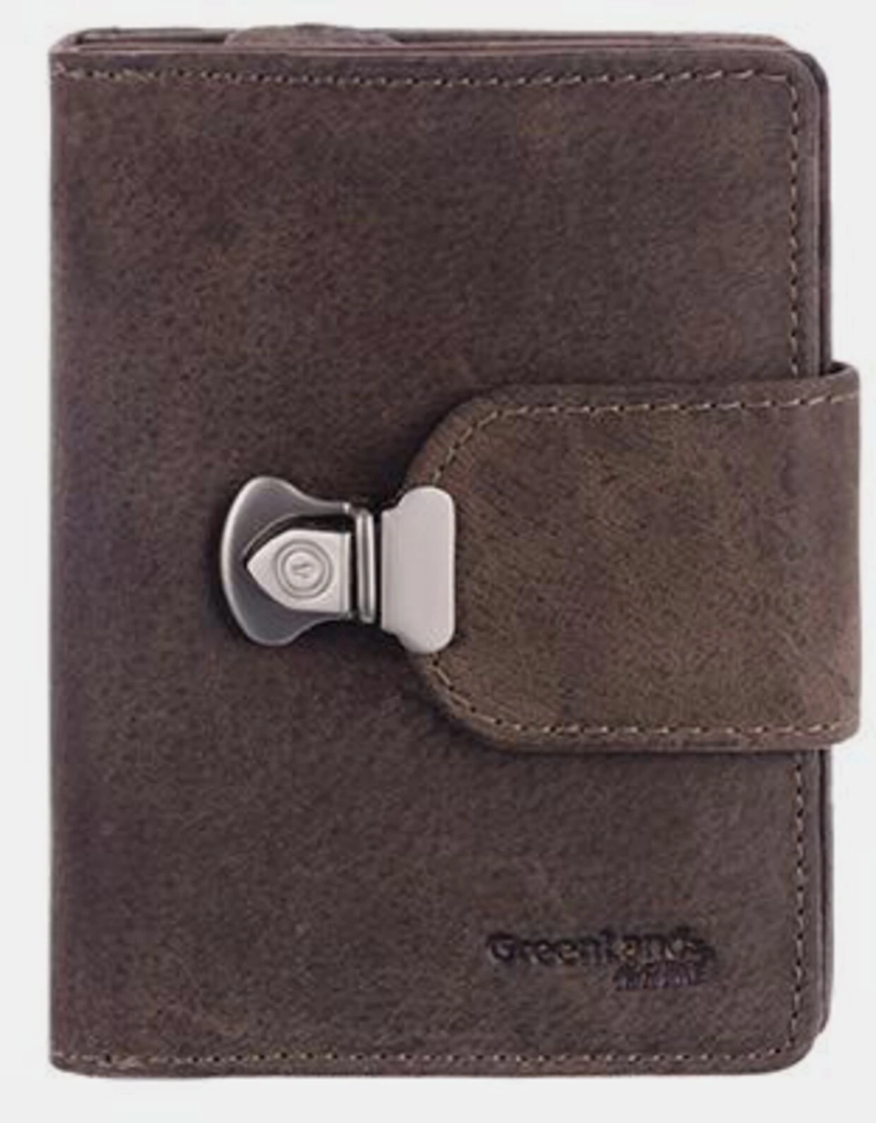 Greenland Geldbörse aus Rindsleder. Hauptfach mit Steckverschluss. 3-teilig, 9 Karten- und 6 Einsteckfächer, ein Sichtfenster, ein Münzfach mit Reißverschluss, 2 Scheinfächer. Gr. ca. B/H/T: 9/12,5/3 cm.