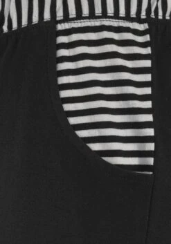 Gestreiftes Shirt mit V-Ausschnitt. ¾-Hose mit seitlichen Taschen, elastischem Bund und Beinsäumen. Hingucker ist der gestreifte Hosenbund und die gestreiften Taschen.Schwarz und Bordeaux aus 100% Baumwolle. Hellgrau meliert: Shirt aus 95% Baumwolle, 5% Polyester. Hose aus 90% Baumwolle, 10% Polyester.