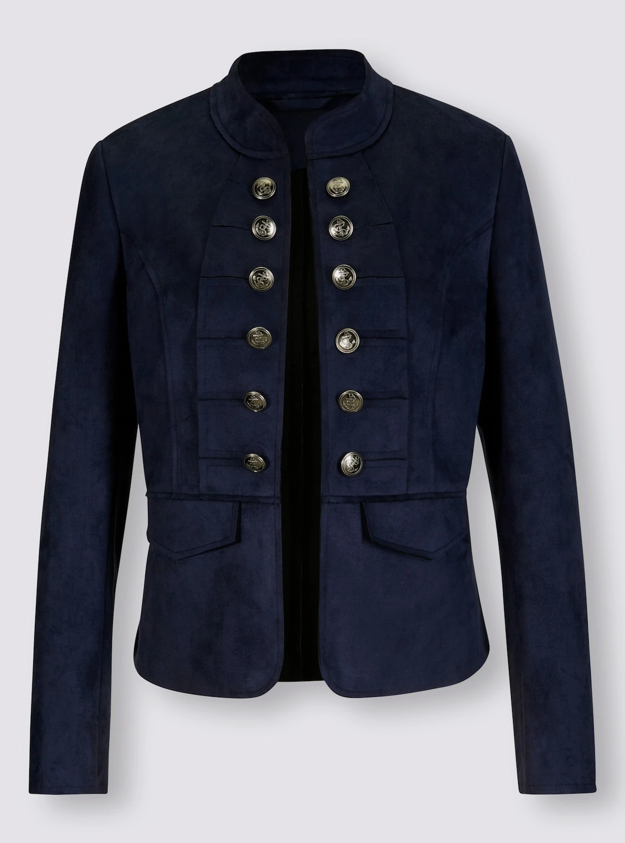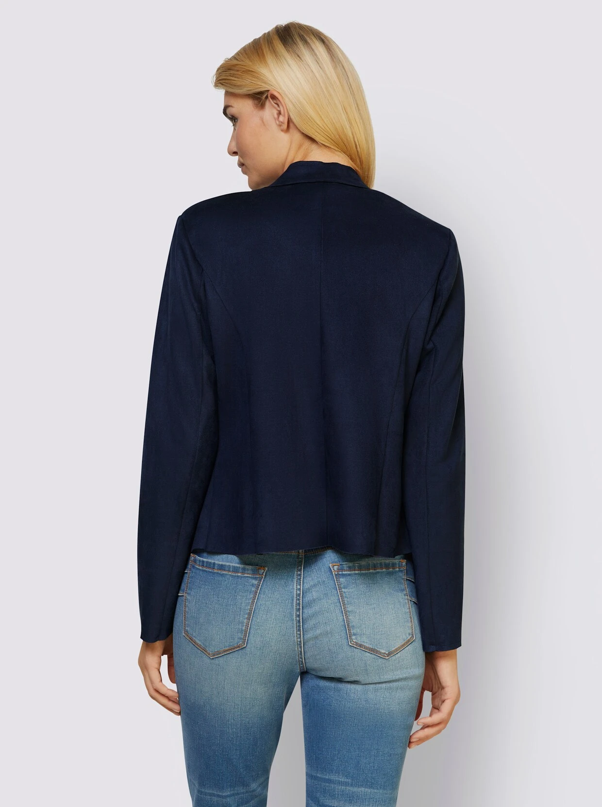 Blazer Moderner, verschlussloser Langarm-Style in Velours-Optik, mit offenen Kanten. Mit Stehkragen, Schmuckknöpfen und Zierpatten. Auf Figur geschnitten und mit Stretch für perfekten Sitz.