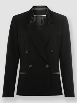Blazer Eleganter Zweireiher mit edel schimmerndem Satin am streckenden Reverskragen und an den Zier-Paspeltaschen. Mit modischen Schlitzen am Langarm. Tailliert, mit formgebenden Wiener Nähten.
