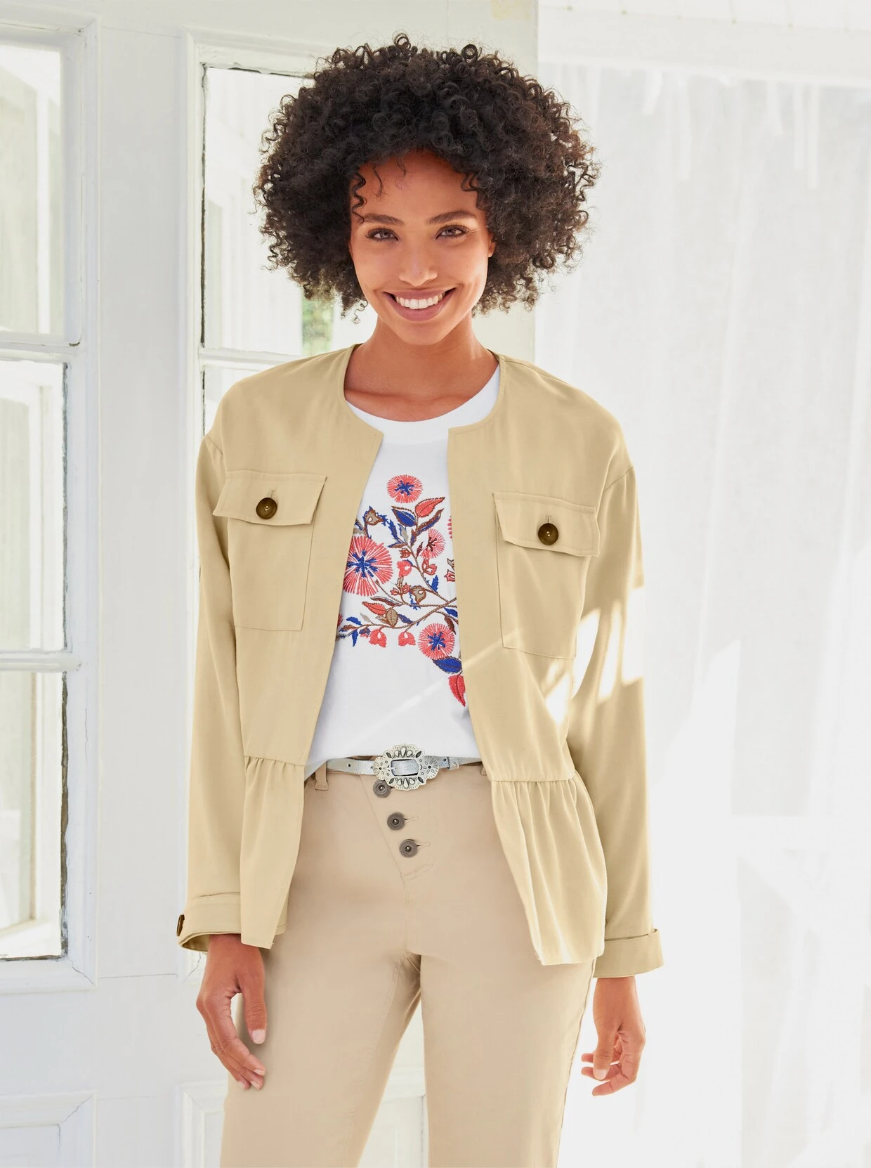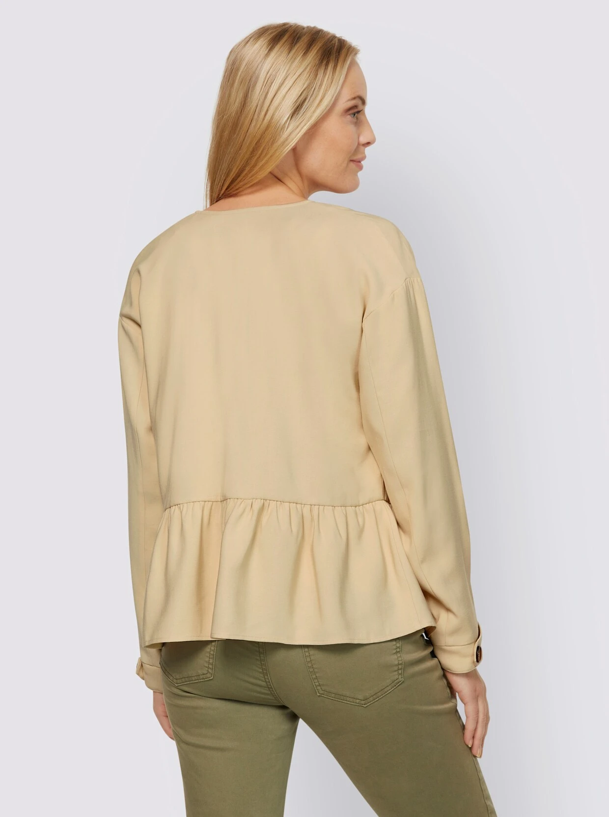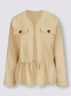 Blusenblazer In weich fließender Viskose-Qualität. Mit Rundhals-Ausschnitt und aufgesetzten Brust-Pattentaschen mit Knöpfen in Horn-Optik. Figurschmeichelndes Schößchen. Modisch verschlusslos. Langarm-Abschluss mit Zierriegel und Knöpfen.