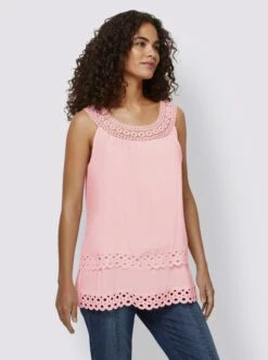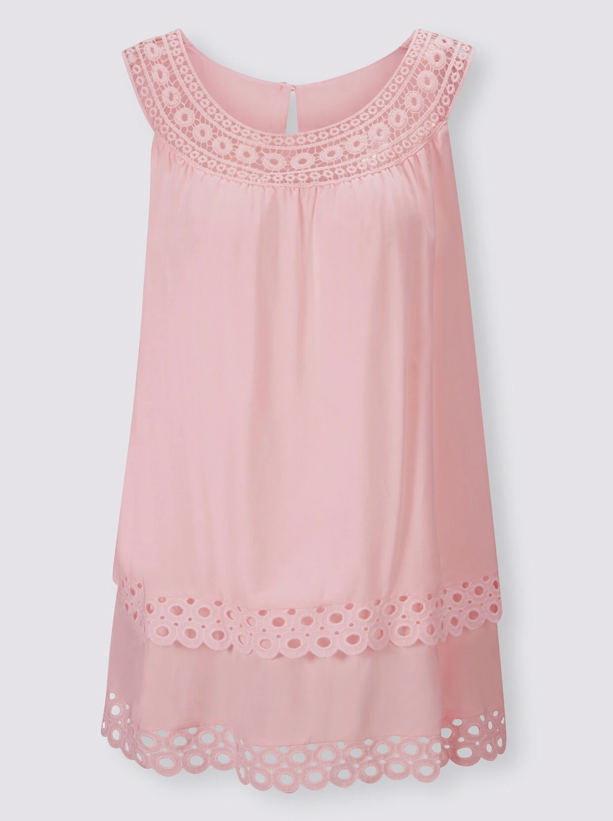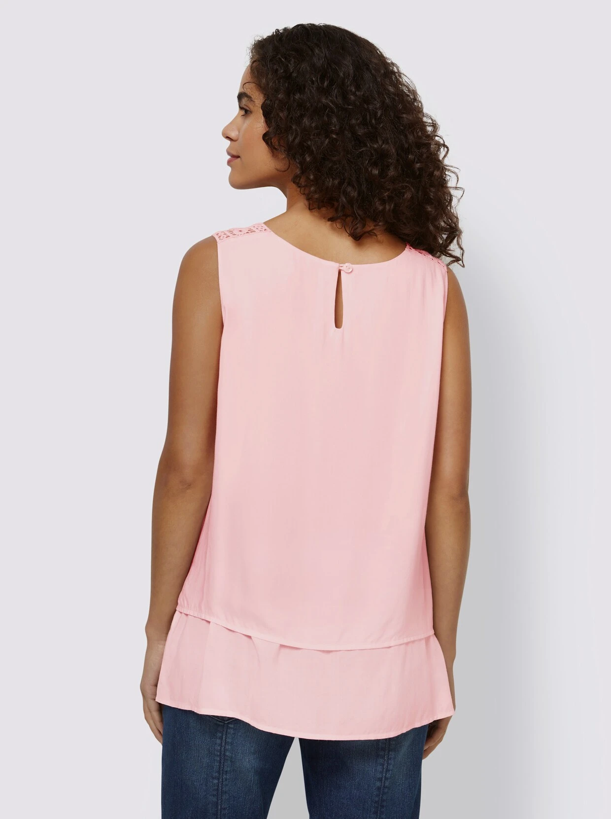 Blusentop In weitem Lagenlook mit Spitzenbesatz. A-Form mit Rundhalsausschnitt und Knopfverschluss hinten.