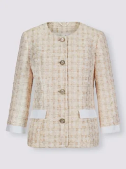Bouclé-Blazer Edles Premiummodell in herrlich trageangenehmer Qualität. Gerade Schnittführung, mit goldfarbenen Schmuckknöpfen. Farblich passende Pattentaschen und Armabschlüsse. 3/4-Arm mit Schlitz.