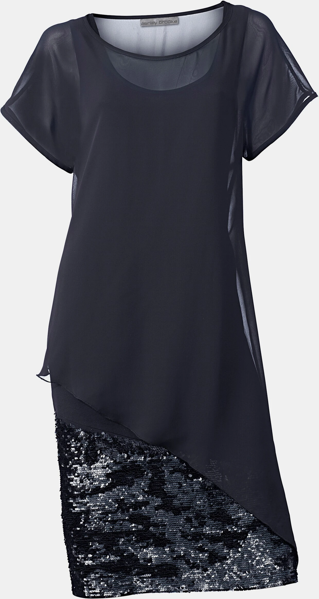 Cocktailkleid Raffinierter Lagen-Look! Figurbetontes Etuikleid, vorne mit funkelndem Paillettenbesatz. Überwurf aus transparentem Chiffon in locker figurumspielender Weite. Mit modischer leicht überschnittener Schulter und Rundhalsausschnitt.