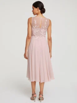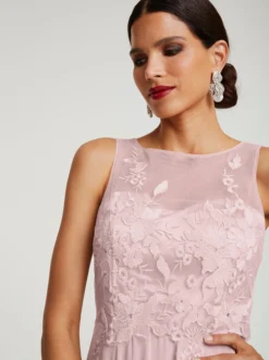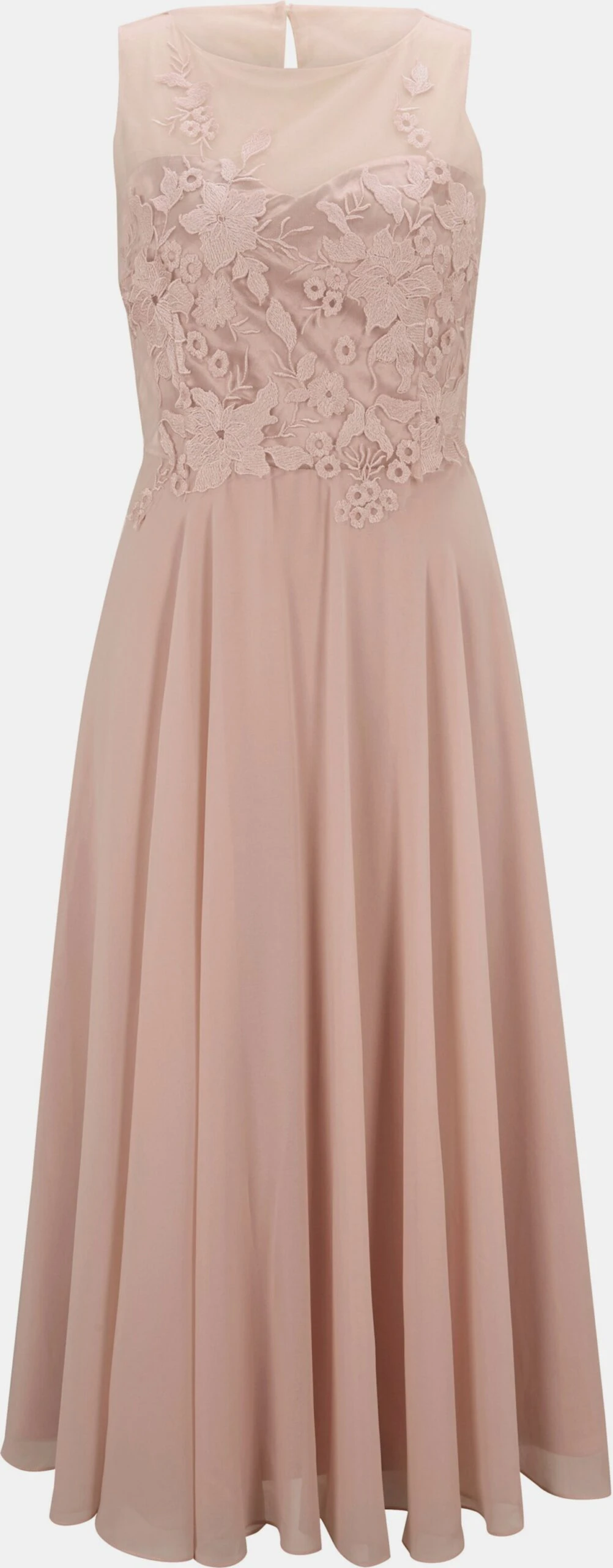 Cocktailkleid Bezaubernd feminin! Figurbetontes Oberteil mit aufwendiger Stickerei und transparentem Einsatz. Im Nacken zu knöpfen. Mit weit ausgestelltem, fließendem Rockteil. Ärmellos, mit Nahtreißverschluss.