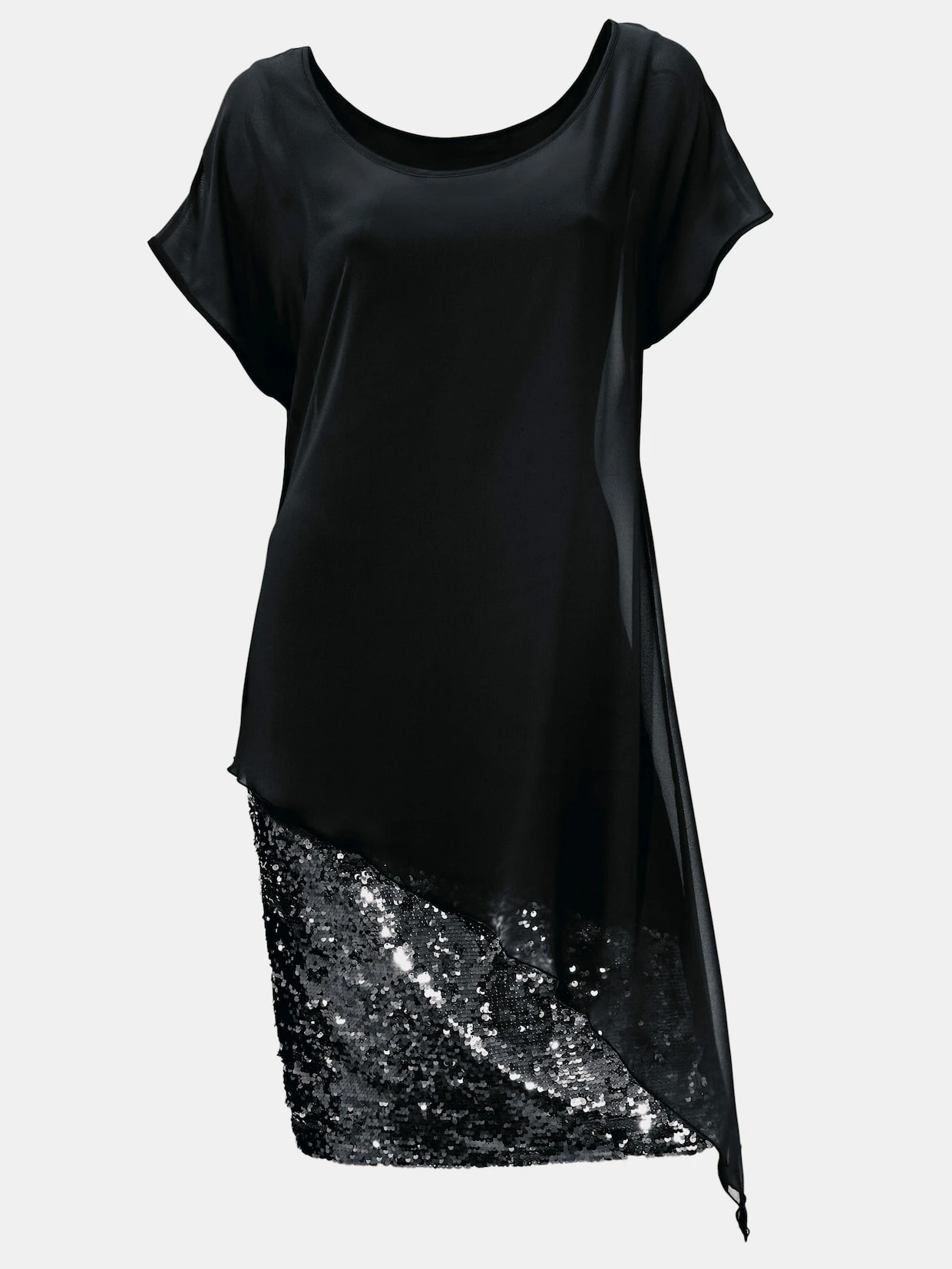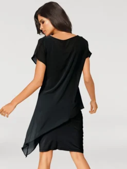 Cocktailkleid Raffinierter Lagen-Look! Figurbetontes Etuikleid, vorne mit funkelndem Paillettenbesatz. Überwurf aus transparentem Chiffon in locker figurumspielender Weite. Mit modischer leicht überschnittener Schulter und Rundhalsausschnitt.