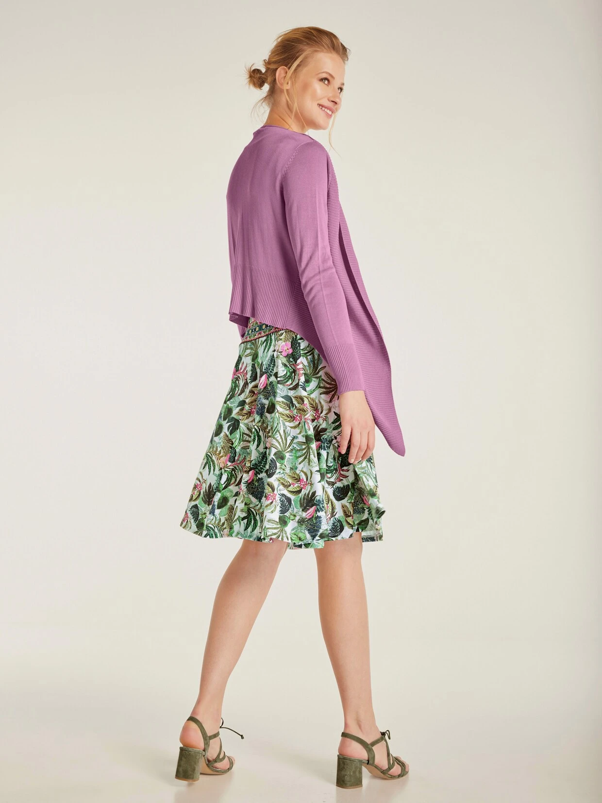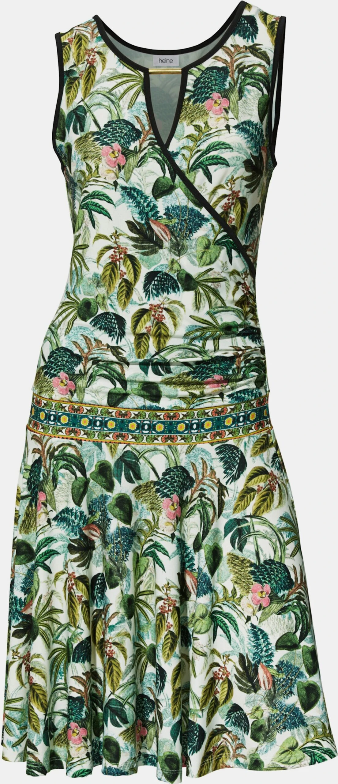 Druck-Kleid Im Trend: Modernes Jungle- Design. Aus fein fließendem Material. Eng anliegendes Oberteil, ausgestellter Rockteil. Idealer Sommerbegleiter. Mit Metallapplikation im Oberteil.