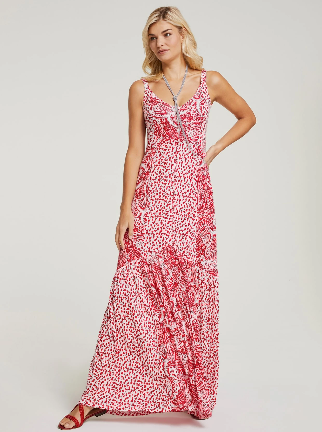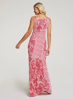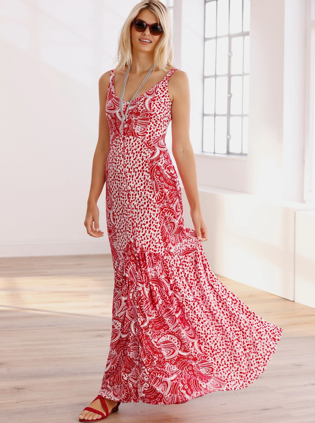 Druck-Kleid Unkompliziertes Maxikleid aus weicher, trageangenehmer Shirtware im attraktiven Floral-Dessin. Figurbetontes Oberteil mit V-Ausschnitt und Trägern. Weit schwingender Rock.